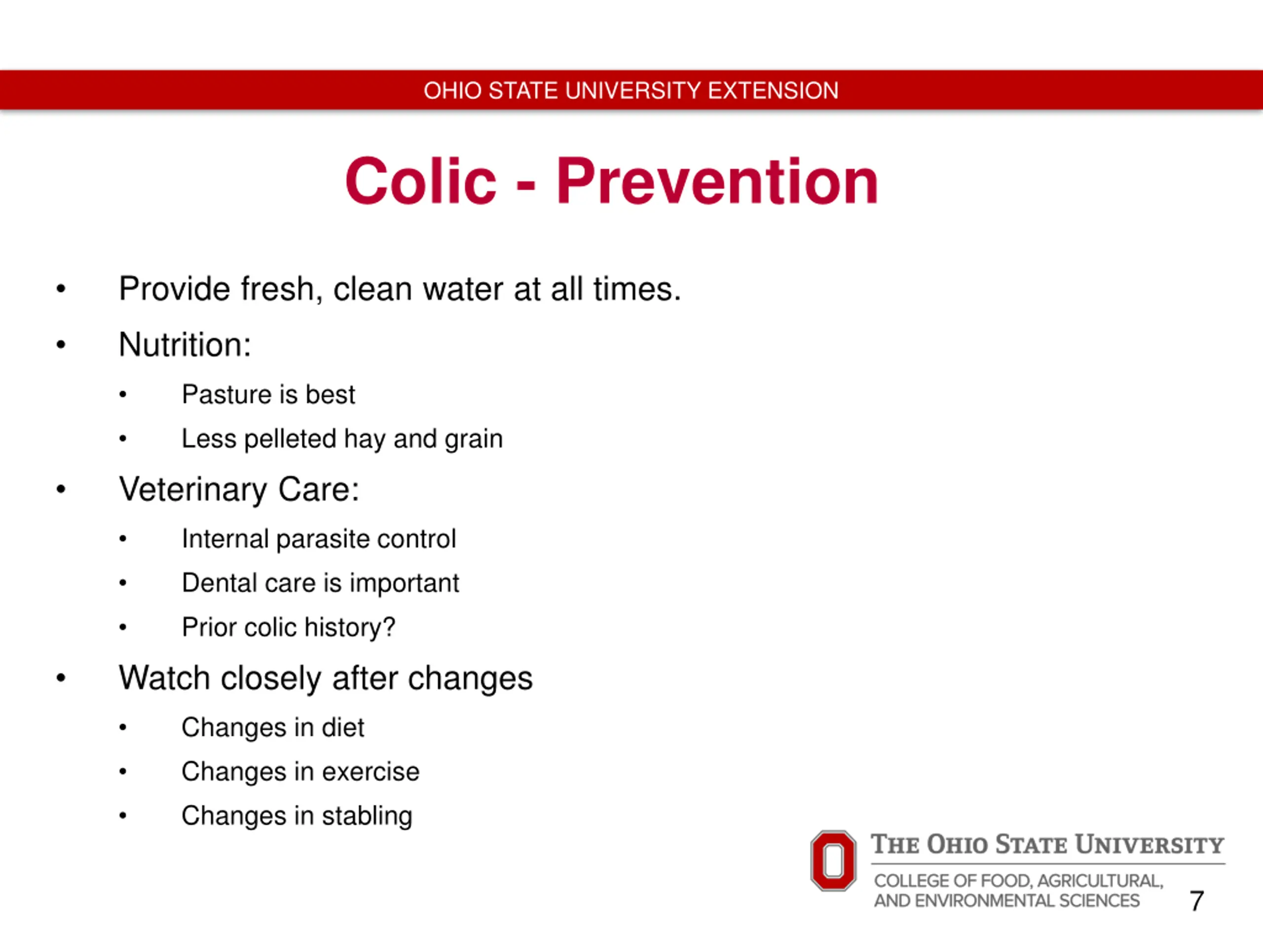 OHIO STATE UNIVERSITY EXTENSION Colic - Prevention Provide fresh, clean water at all times. Nutrition: Pasture is best Less pelleted hay and grain Veterinary Care: Internal parasite control Dental care is important Prior colic history? Watch closely after changes Changes in diet Changes in exercise Changes in stabling 7