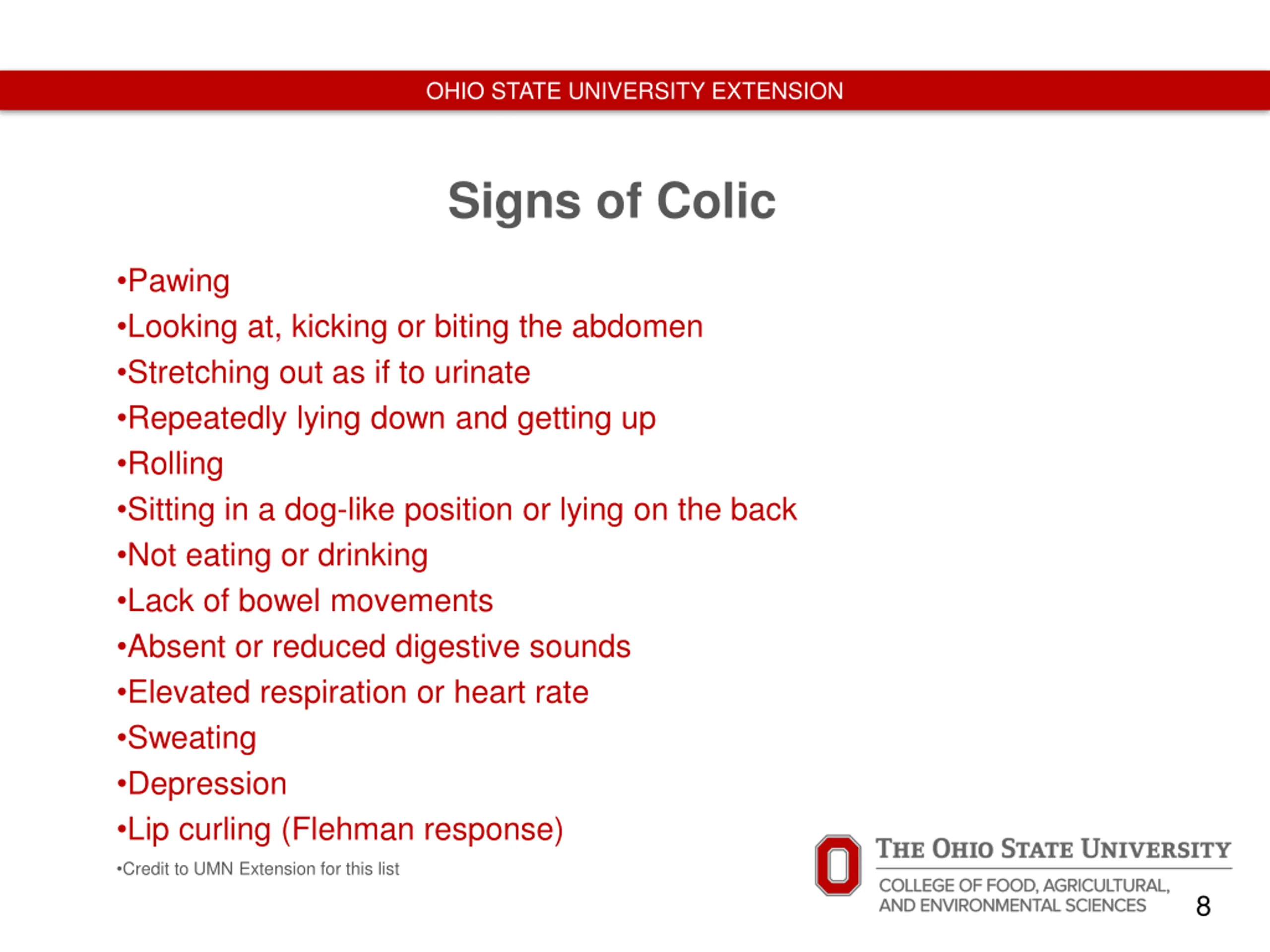 OHIO STATE UNIVERSITY EXTENSION Signs of Colic Pawing Looking at, kicking or biting the abdomen Stretching out as if to urinate Repeatedly lying down and getting up Rolling Sitting in a dog-like position or lying on the back Not eating or drinking Lack of bowel movements Absent or reduced digestive sounds Elevated respiration or heart rate Sweating Depression Lip curling (Flehman response) Credit to UMN Extension for this list 8