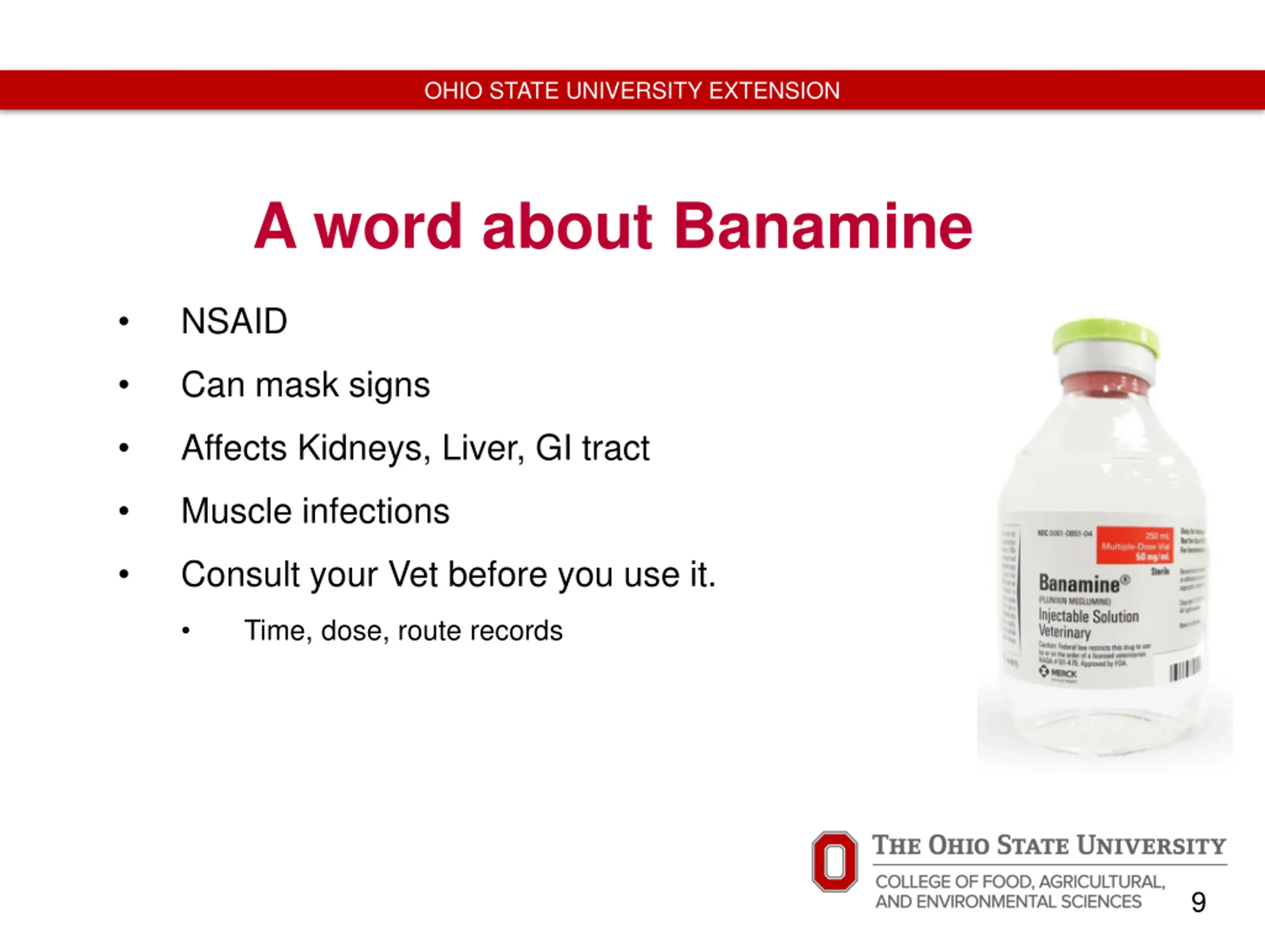 OHIO STATE UNIVERSITY EXTENSION A word about Banamine NSAID http://www.allivet.com/images/product/large/452.jpg Can mask signs Affects Kidneys, Liver, GI tract Muscle infections Consult your Vet before you use it. Time, dose, route records 9