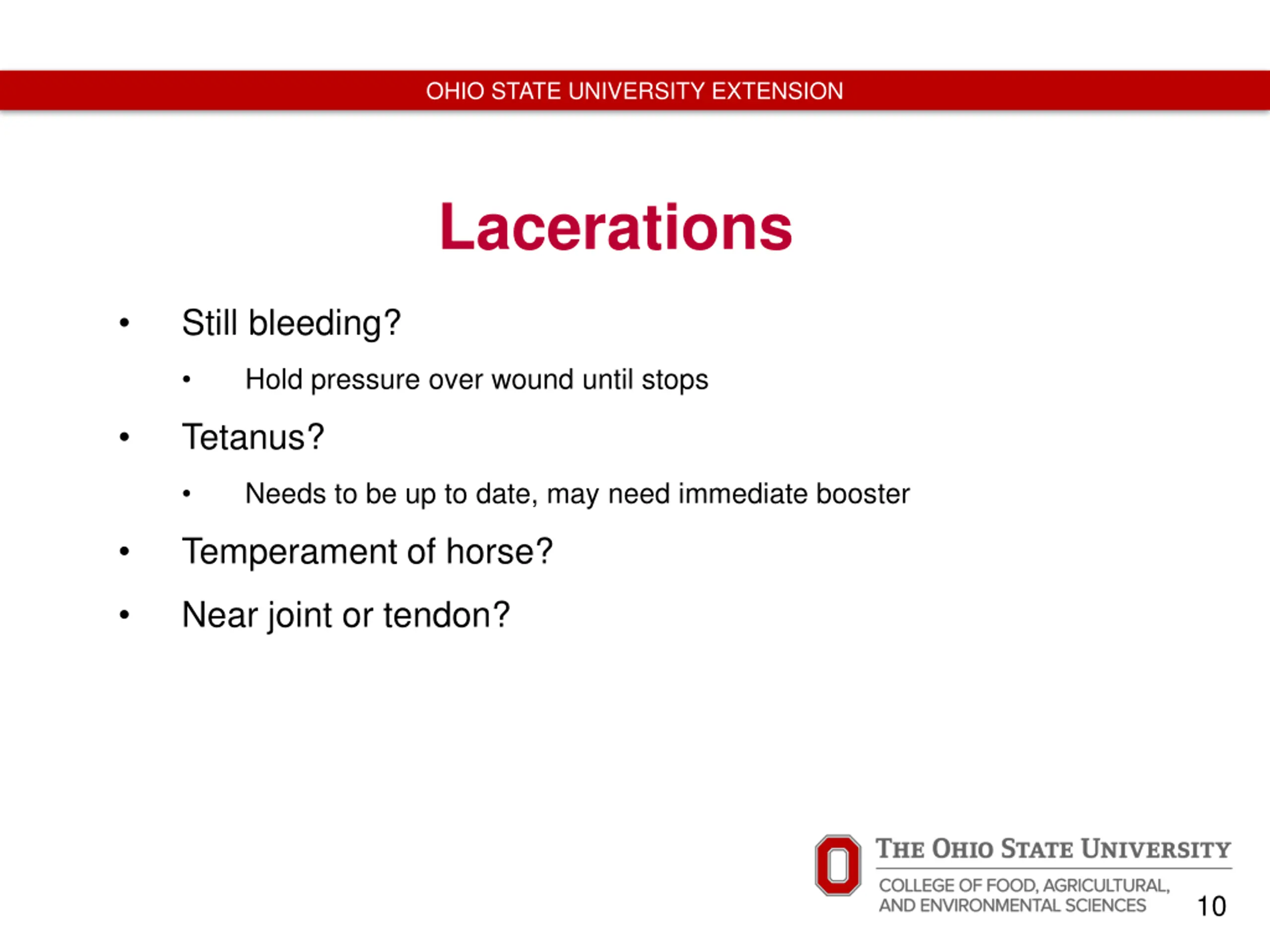 OHIO STATE UNIVERSITY EXTENSION Lacerations Still bleeding? Hold pressure over wound until stops Tetanus? Needs to be up to date, may need immediate booster Temperament of horse? Near joint or tendon? 10