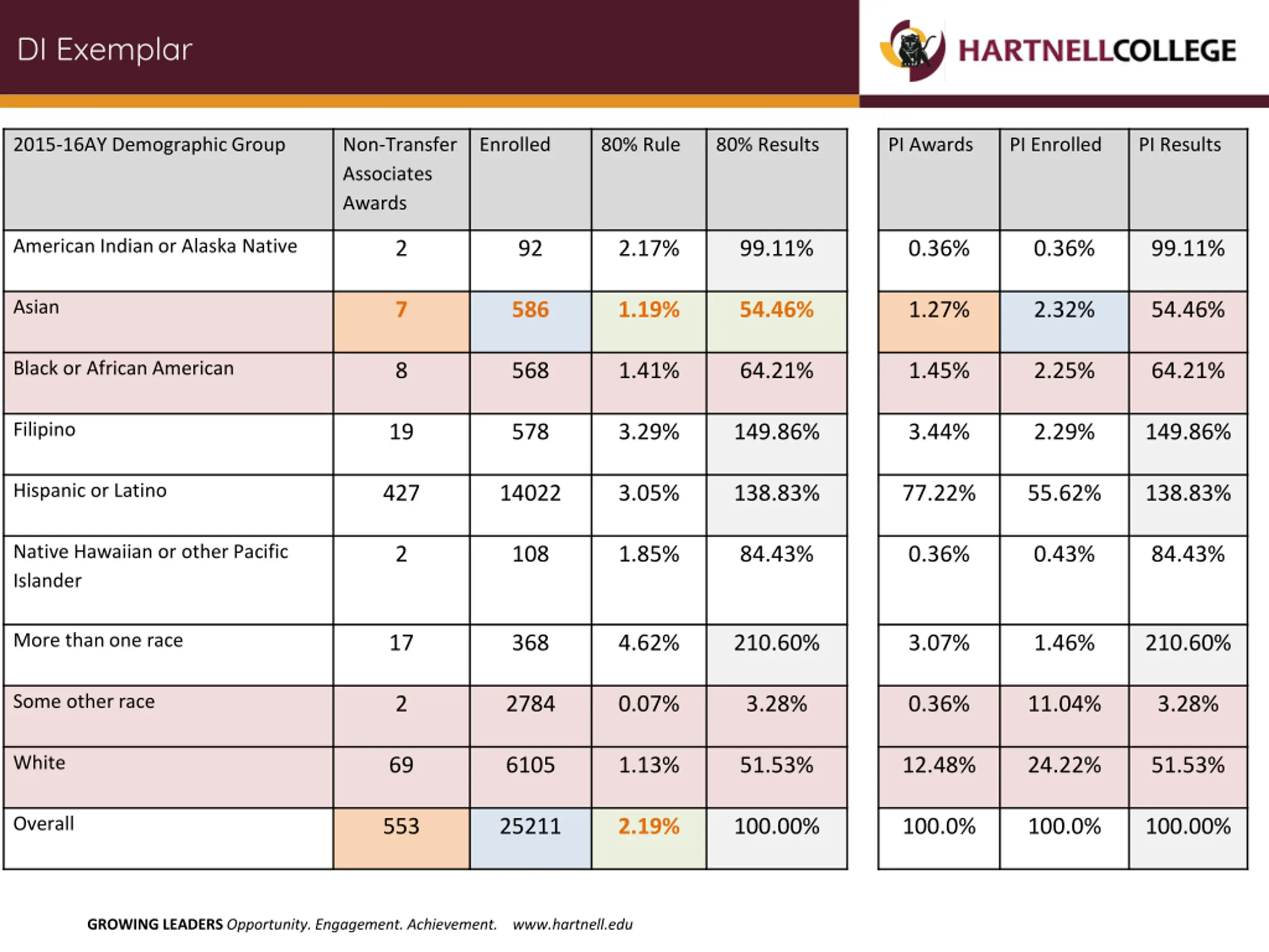 DI Exemplar 2015-16AY Demographic Group Non-Transfer Associates Awards Enrolled 80% Rule 80% Results PI Awards PI Enrolled PI Results American Indian or Alaska Native 2 92 2.17% 99.11% 0.36% 0.36% 99.11% Asian 7 586 1.19% 54.46% 1.27% 2.32% 54.46% Black or African American 8 568 1.41% 64.21% 1.45% 2.25% 64.21% Filipino 19 578 3.29% 149.86% 3.44% 2.29% 149.86% Hispanic or Latino 427 14022 3.05% 138.83% 77.22% 55.62% 138.83% Native Hawaiian or other Pacific Islander 2 108 1.85% 84.43% 0.36% 0.43% 84.43% More than one race 17 368 4.62% 210.60% 3.07% 1.46% 210.60% Some other race 2 2784 0.07% 3.28% 0.36% 11.04% 3.28% White 69 6105 1.13% 51.53% 12.48% 24.22% 51.53% Overall 553 25211 2.19% 100.00% 100.0% 100.0% 100.00% GROWING LEADERS Opportunity. Engagement. Achievement. www.hartnell.edu