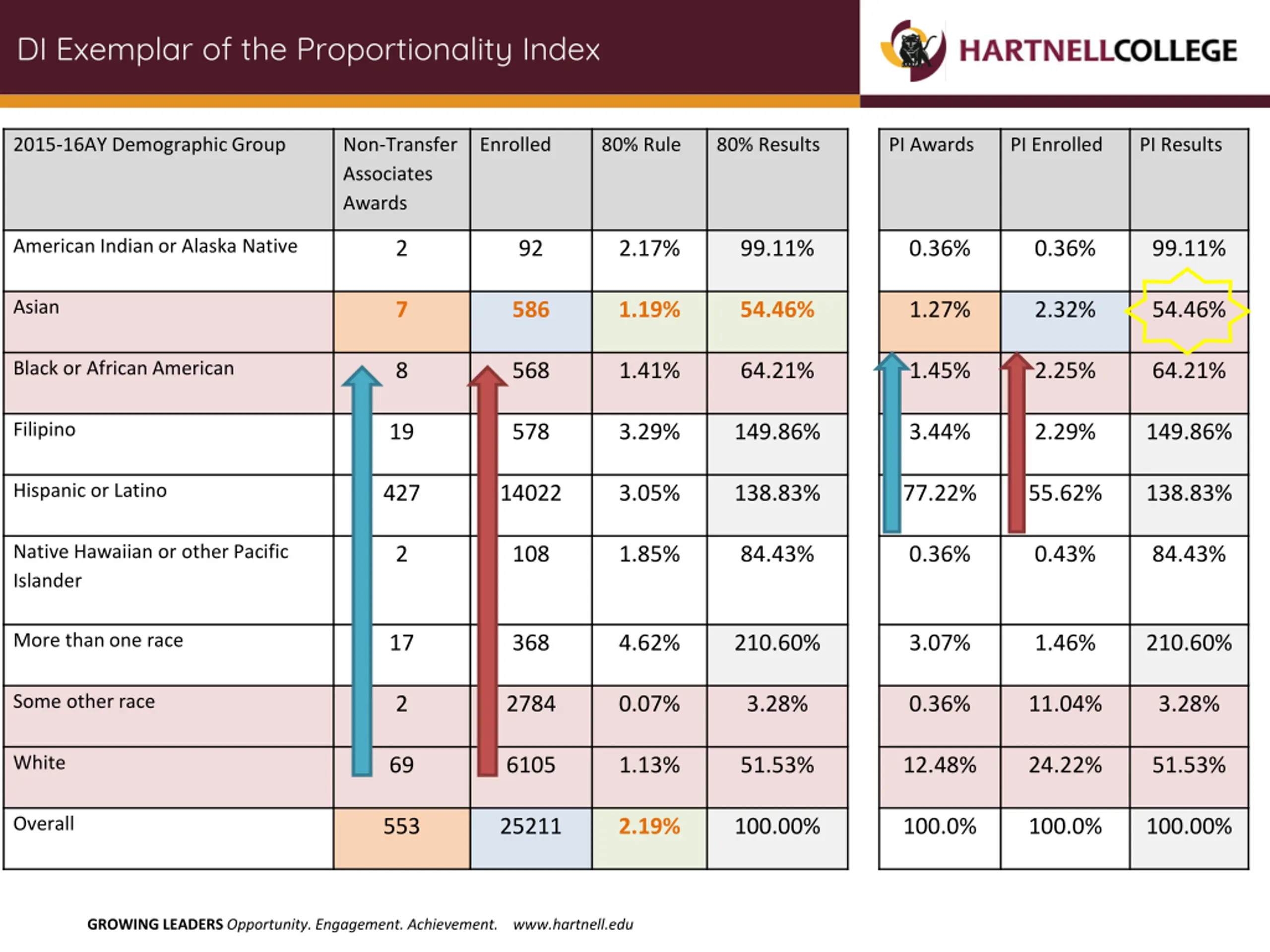 DI Exemplar of the Proportionality Index 2015-16AY Demographic Group Non-Transfer Associates Awards Enrolled 80% Rule 80% Results PI Awards PI Enrolled PI Results American Indian or Alaska Native 2 92 2.17% 99.11% 0.36% 0.36% 99.11% Asian 7 586 1.19% 54.46% 1.27% 2.32% 54.46% Black or African American 8 568 1.41% 64.21% 1.45% 2.25% 64.21% Filipino 19 578 3.29% 149.86% 3.44% 2.29% 149.86% Hispanic or Latino 427 14022 3.05% 138.83% 77.22% 55.62% 138.83% Native Hawaiian or other Pacific Islander 2 108 1.85% 84.43% 0.36% 0.43% 84.43% More than one race 17 368 4.62% 210.60% 3.07% 1.46% 210.60% Some other race 2 2784 0.07% 3.28% 0.36% 11.04% 3.28% White 69 6105 1.13% 51.53% 12.48% 24.22% 51.53% Overall 553 25211 2.19% 100.00% 100.0% 100.0% 100.00% GROWING LEADERS Opportunity. Engagement. Achievement. www.hartnell.edu