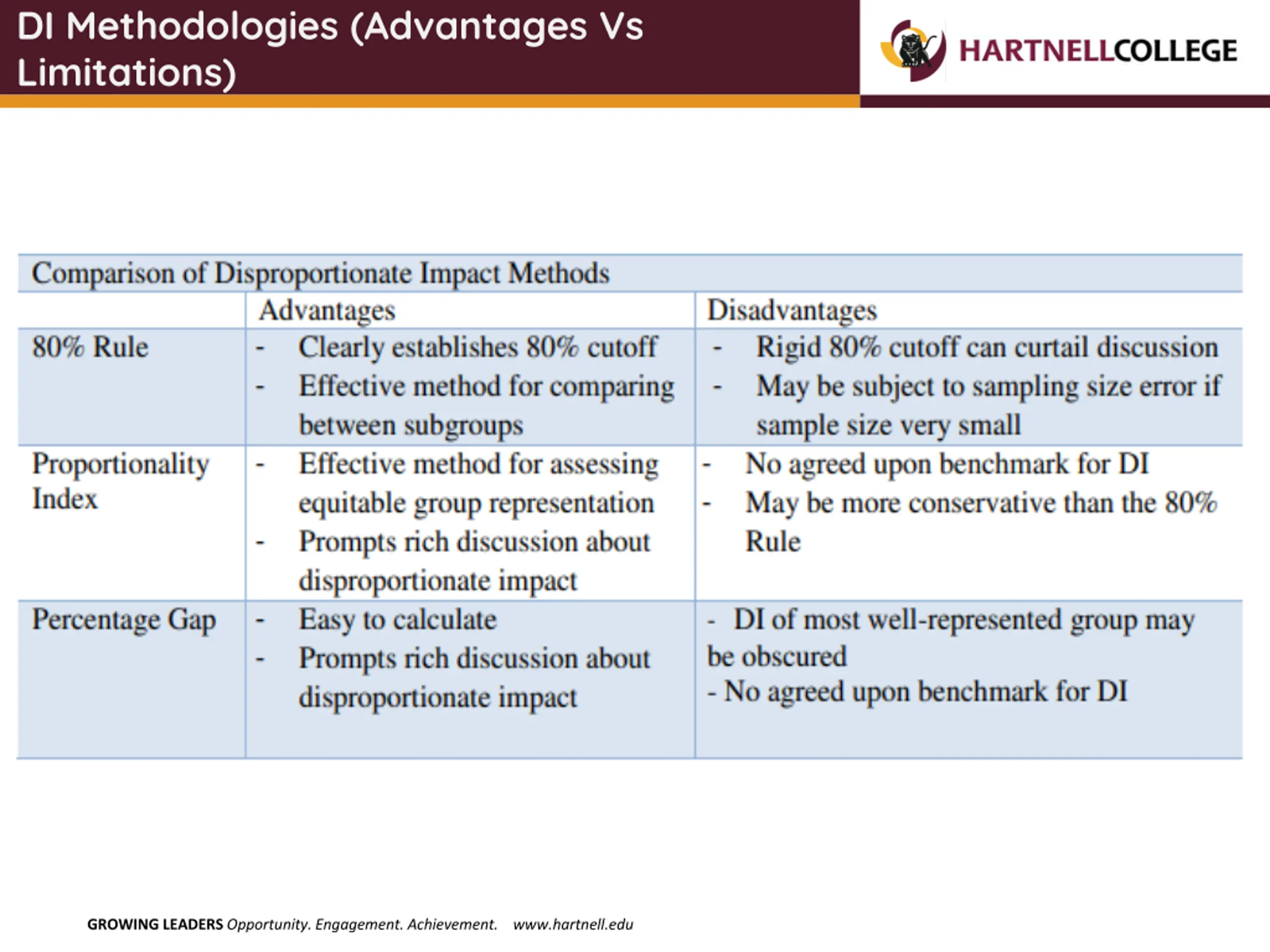 Disporportionate Impact (DI) Methodologies The CCCCO uses The 80% Rule to calculate DI among enrollment, retention, success & completion metrics. Does a subgroup achieve the desired outcome less than 80% of the time? 80% index = cohort group rate reference group rate based on the Equal Employment Opportunity Commission (EEOC) 80% Rule in which a selection rate for any race, sex, or ethnic group is less than four-fifths will generally be regarded by Federal enforcement agencies (e.g., Title VII enforcement by the U.S. Equal Opportunity Commission, Department of Labor, and the Department of Justice) as evidence of adverse impact (CCCCO, 2014). Other methods include: The Percentage Point Gap (PPG): Is there a difference in a given demographic group and the observed overall average/mean across all demographic groups? Percentage point gap = % of outcome for students in subgroup % of outcome for all students The Proportionality Index (PI): If a subgroup of students represents 45% of the student body, does that same subgroup also represent at least 45% of the students who achieve the desired outcome? Proportionality index = proportion in outcome group proportion in cohort GROWING LEADERS Opportunity. Engagement. Achievement. www.hartnell.edu