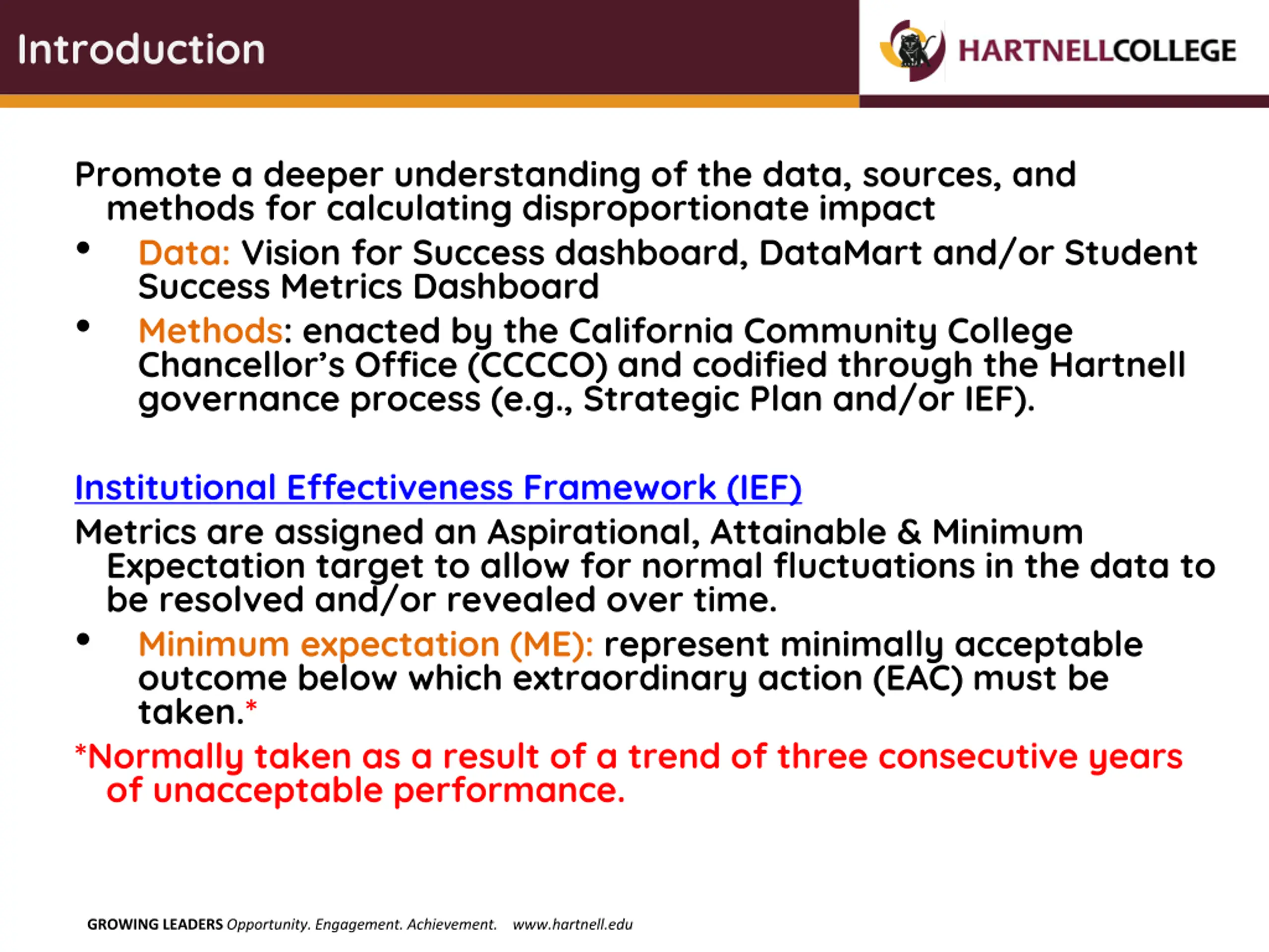 Introduction Promote a deeper understanding of the data, sources, and methods for calculating disproportionate impact Data: Vision for Success dashboard, DataMart and/or Student Success Metrics Dashboard Methods: enacted by the California Community College Chancellor s Office (CCCCO) and codified through the Hartnell governance process (e.g., Strategic Plan and/or IEF). Institutional Effectiveness Framework (IEF) Metrics are assigned an Aspirational, Attainable & Minimum Expectation target to allow for normal fluctuations in the data to be resolved and/or revealed over time. Minimum expectation (ME): represent minimally acceptable outcome below which extraordinary action (EAC) must be taken.* *Normally taken as a result of a trend of three consecutive years of unacceptable performance. GROWING LEADERS Opportunity. Engagement. Achievement. www.hartnell.edu