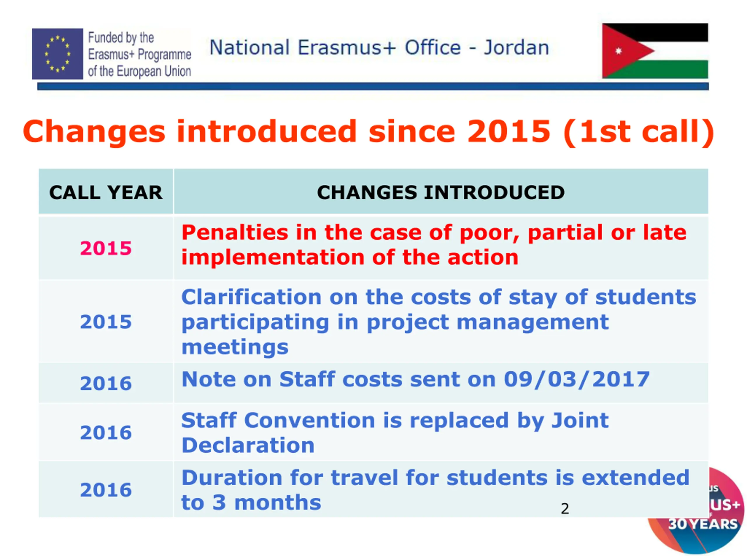 Changes introduced since 2015 (1st call) CALL YEAR CHANGES INTRODUCED Penalties in the case of poor, partial or late implementation of the action 2015 Clarification on the costs of stay of students participating in project management meetings Note on Staff costs sent on 09/03/2017 2015 2016 Staff Convention is replaced by Joint Declaration Duration for travel for students is extended to 3 months 2016 2016 2