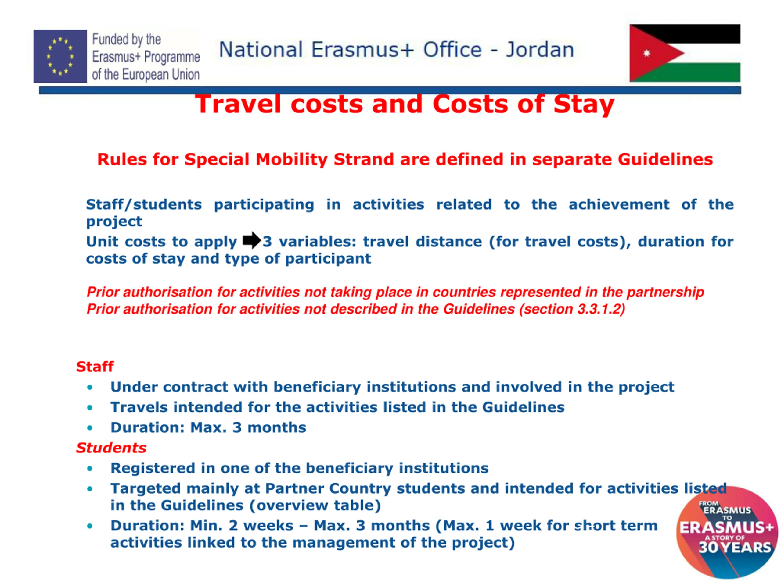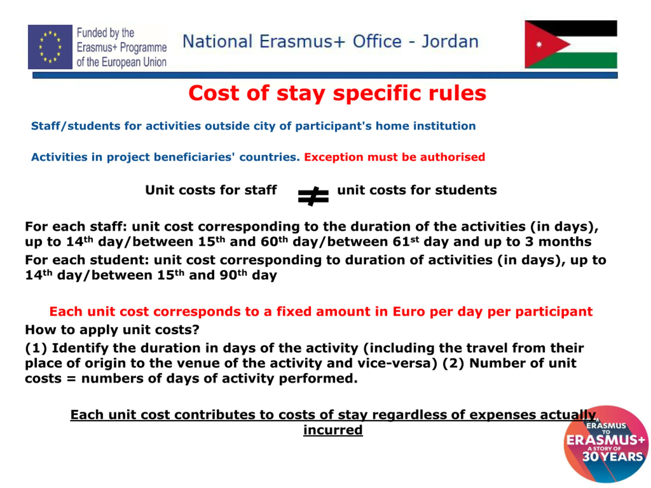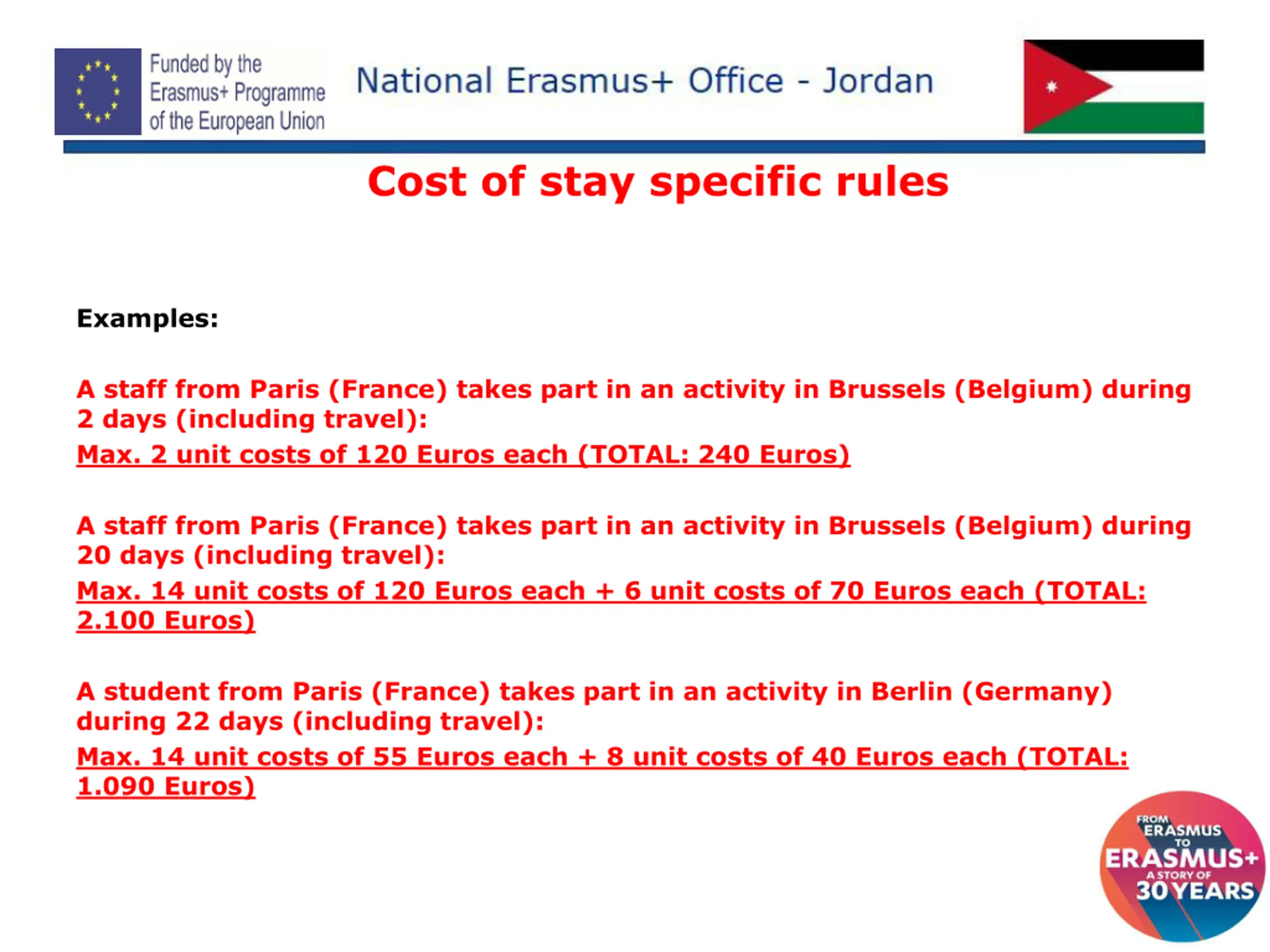 Cost of stay specific rules Examples: A staff from Paris (France) takes part in an activity in Brussels (Belgium) during 2 days (including travel): Max. 2 unit costs of 120 Euros each (TOTAL: 240 Euros) A staff from Paris (France) takes part in an activity in Brussels (Belgium) during 20 days (including travel): Max. 14 unit costs of 120 Euros each + 6 unit costs of 70 Euros each (TOTAL: 2.100 Euros) A student from Paris (France) takes part in an activity in Berlin (Germany) during 22 days (including travel): Max. 14 unit costs of 55 Euros each + 8 unit costs of 40 Euros each (TOTAL: 1.090 Euros) 20