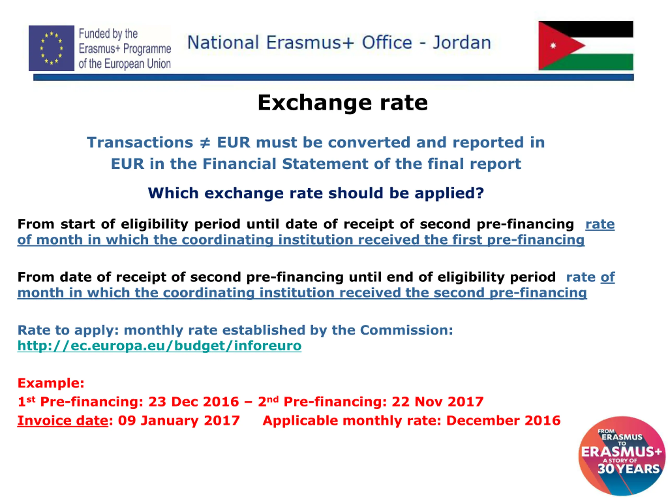 Exchange rate Transactions EUR must be converted and reported in EUR in the Financial Statement of the final report Which exchange rate should be applied? From start of eligibility period until date of receipt of second pre-financing: rate of month in which the coordinating institution received the first pre-financing From date of receipt of second pre-financing until end of eligibility period: rate of month in which the coordinating institution received the second pre-financing Rate to apply: monthly rate established by the Commission: http://ec.europa.eu/budget/inforeuro Example: 1st Pre-financing: 23 Dec 2016 2nd Pre-financing: 22 Nov 2017 Invoice date: 09 January 2017 Applicable monthly rate: December 2016 6