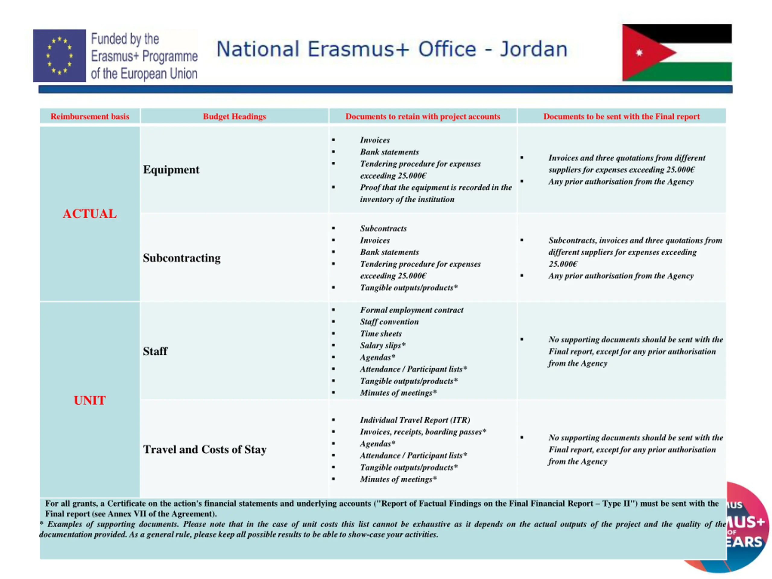 Reimbursement basis Budget Headings Documents to retain with project accounts Documents to be sent with the Final report Invoices Bank statements Tendering procedure for expenses exceeding 25.000 Proof that the equipment is recorded in the inventory of the institution Invoices and three quotations from different suppliers for expenses exceeding 25.000 Any prior authorisation from the Agency Equipment ACTUAL Subcontracts Invoices Bank statements Tendering procedure for expenses exceeding 25.000 Tangible outputs/products* Subcontracts, invoices and three quotations from different suppliers for expenses exceeding 25.000 Any prior authorisation from the Agency Subcontracting Formal employment contract Staff convention Time sheets Salary slips* Agendas* Attendance / Participant lists* Tangible outputs/products* Minutes of meetings* No supporting documents should be sent with the Final report, except for any prior authorisation from the Agency Staff UNIT Individual Travel Report (ITR) Invoices, receipts, boarding passes* Agendas* Attendance / Participant lists* Tangible outputs/products* Minutes of meetings* No supporting documents should be sent with the Final report, except for any prior authorisation from the Agency Travel and Costs of Stay For all grants, a Certificate on the action's financial statements and underlying accounts ("Report of Factual Findings on the Final Financial Report Type II") must be sent with the Final report (see Annex VII of the Agreement). * Examples of supporting documents. Please note that in the case of unit costs this list cannot be exhaustive as it depends on the actual outputs of the project and the quality of the documentation provided. As a general rule, please keep all possible results to be able to show-case your activities. 22