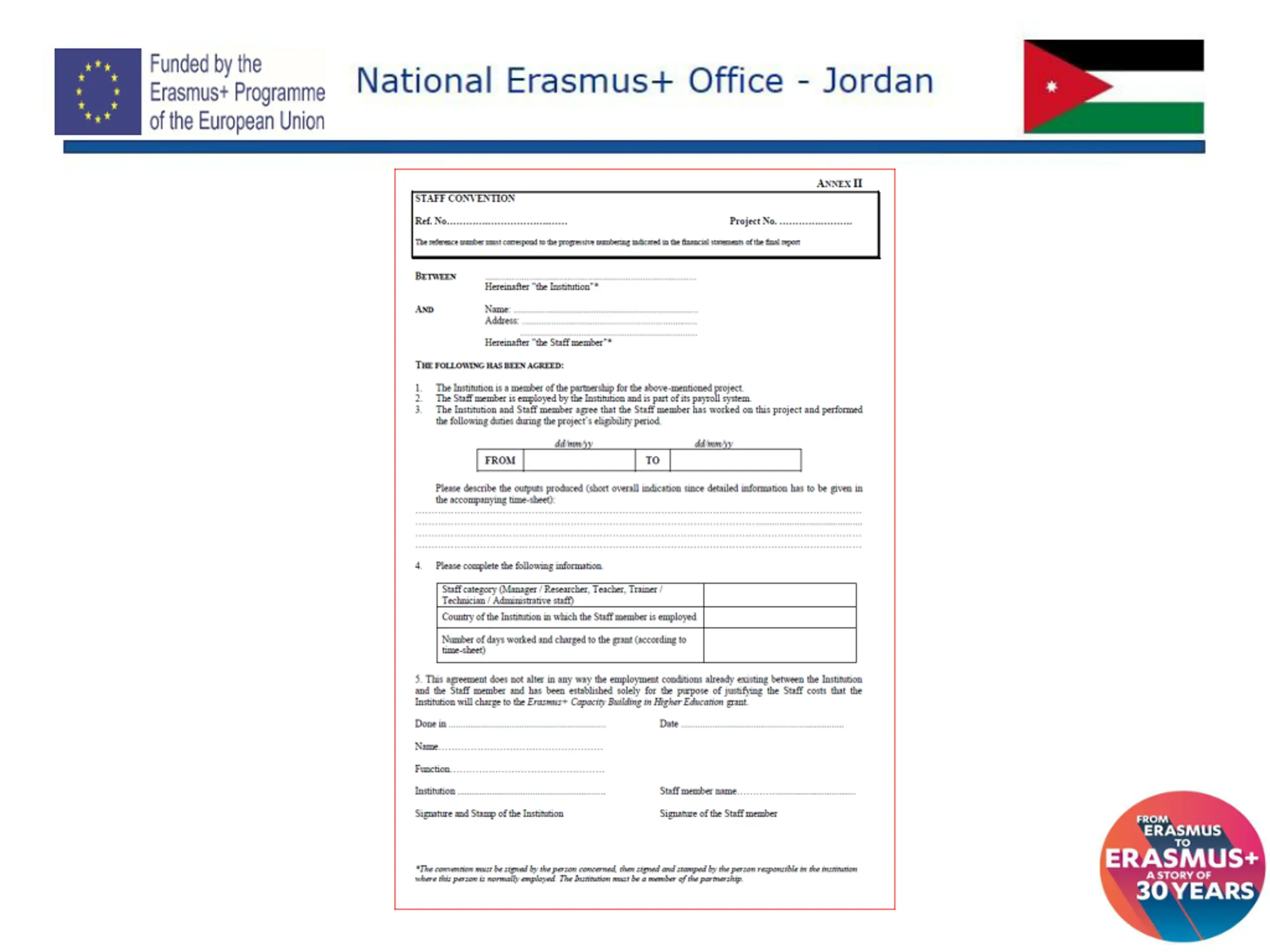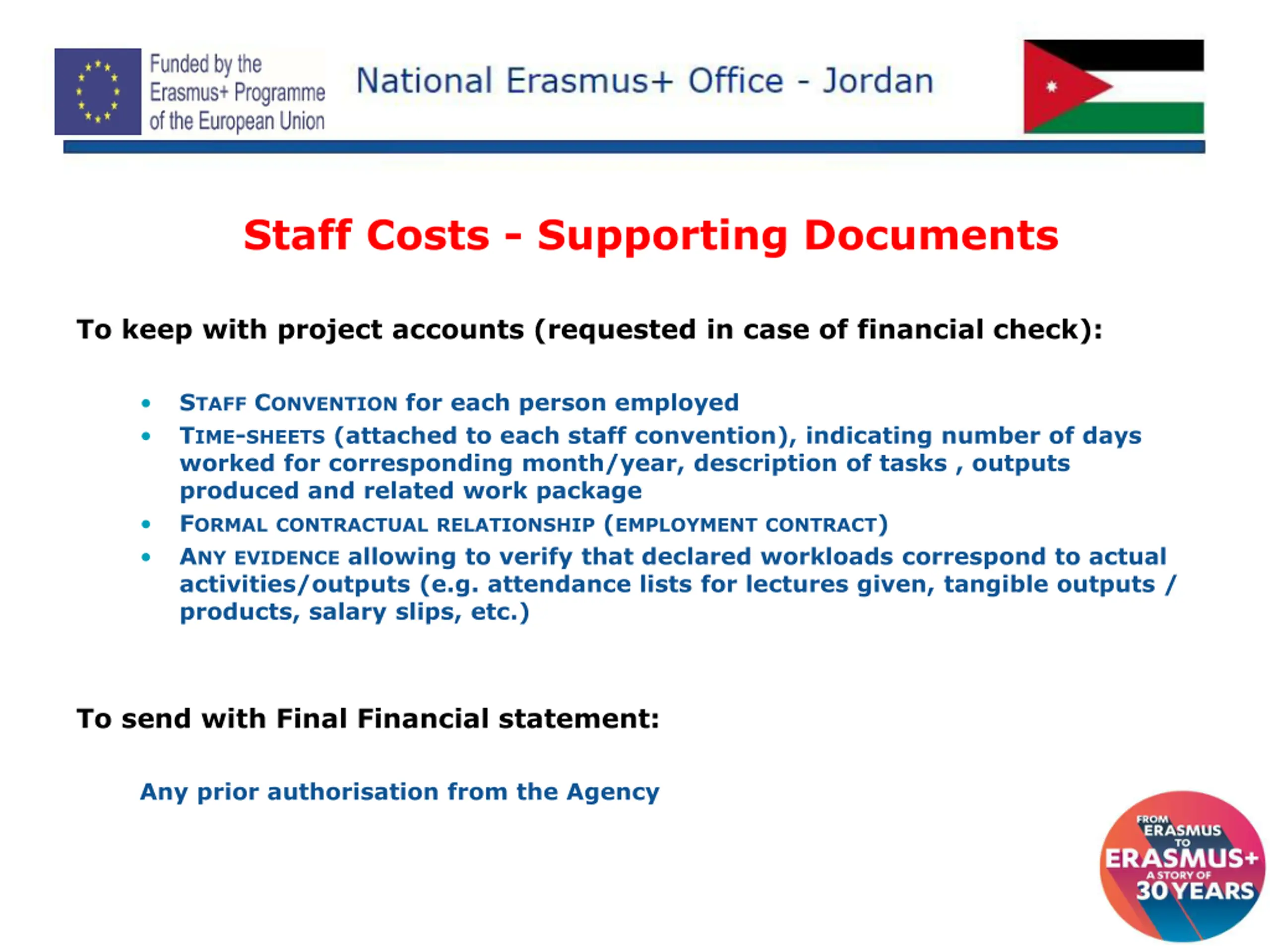 Staff Costs - Supporting Documents To keep with project accounts (requested in case of financial check): STAFF CONVENTION for each person employed TIME-SHEETS (attached to each staff convention), indicating number of days worked for corresponding month/year, description of tasks , outputs produced and related work package FORMALCONTRACTUALRELATIONSHIP (EMPLOYMENTCONTRACT) ANYEVIDENCE allowing to verify that declared workloads correspond to actual activities/outputs (e.g. attendance lists for lectures given, tangible outputs / products, salary slips, etc.) To send with Final Financial statement: Any prior authorisation from the Agency 14
