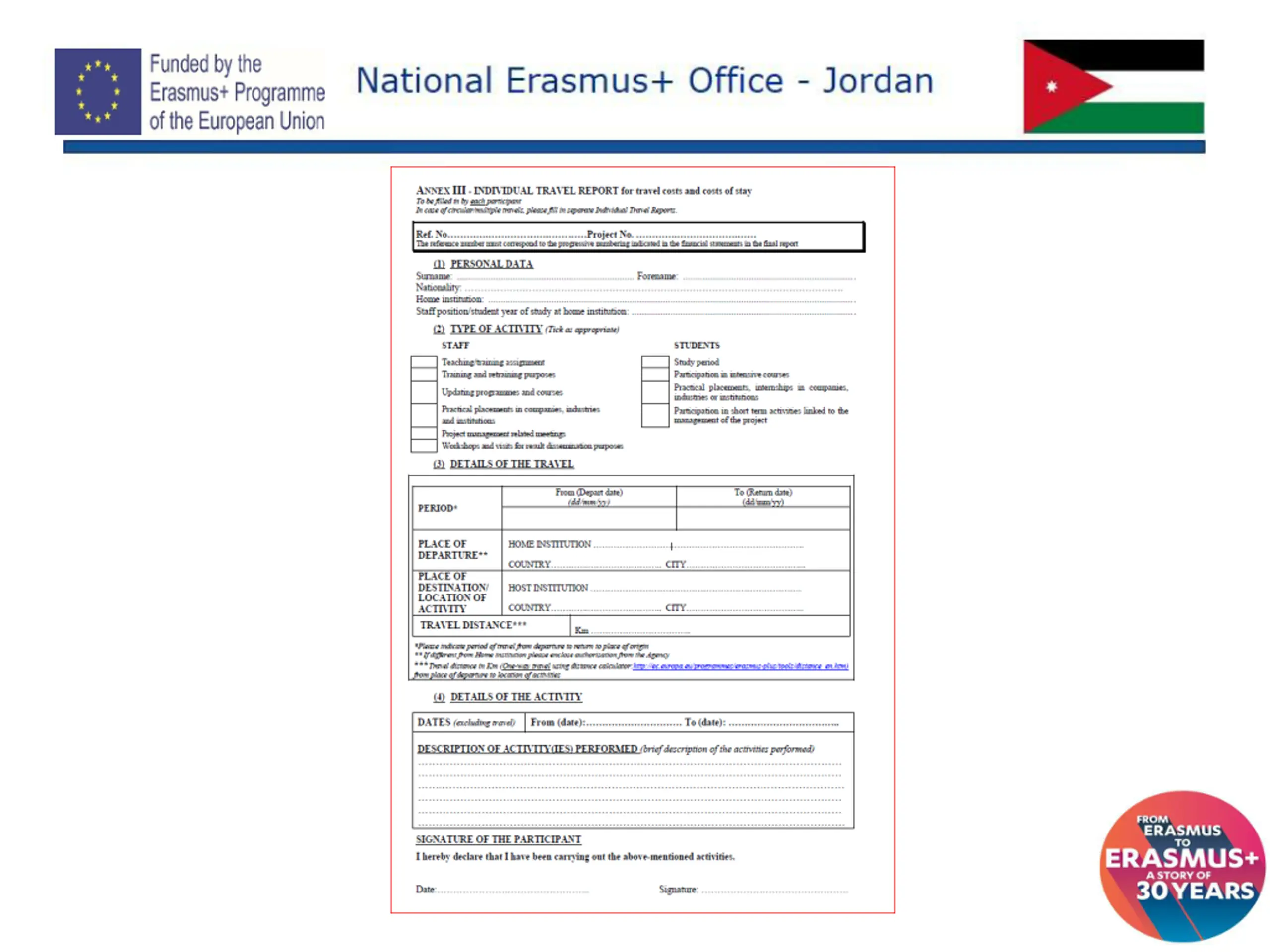Travel and Costs of Stay - Supporting documents Justification for the following elements: - Journeys actually took place - Journeys connected to specific and identifiable project-related activities To be retained with project accounts: INDIVIDUAL TRAVEL REPORT + Supporting documents (e.g. travel tickets, boarding passes, invoices, receipts, proof of attendance in meetings and/or events, agendas, tangible outputs/products, minutes of meetings) To be provided with Final Financial statement: Any prior authorisation from the Agency 16