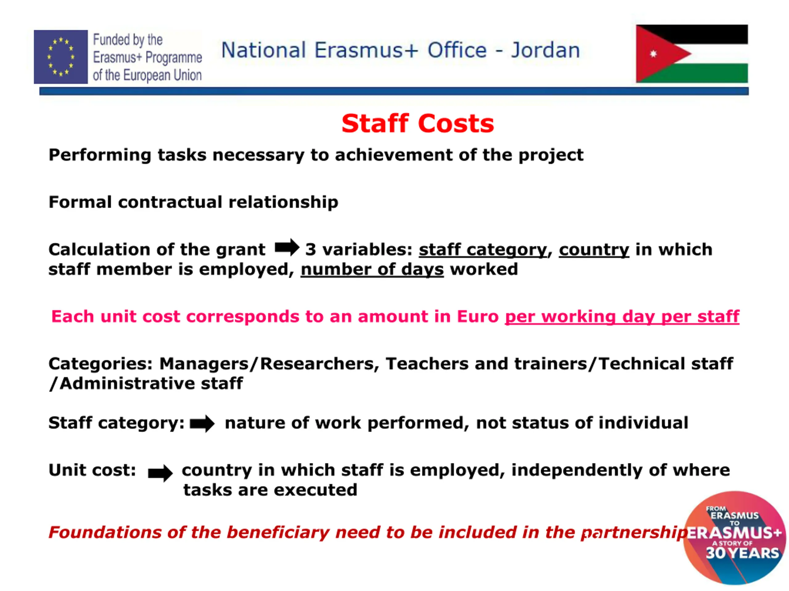 Staff Costs Performing tasks necessary to achievement of the project Formal contractual relationship Calculation of the grant 3 variables: staff category, country in which staff member is employed, number of days worked Each unit cost corresponds to an amount in Euro per working day per staff Categories: Managers/Researchers, Teachers and trainers/Technical staff /Administrative staff Staff category: nature of work performed, not status of individual Unit cost: country in which staff is employed, independently of where tasks are executed Foundations of the beneficiary need to be included in the partnership 12