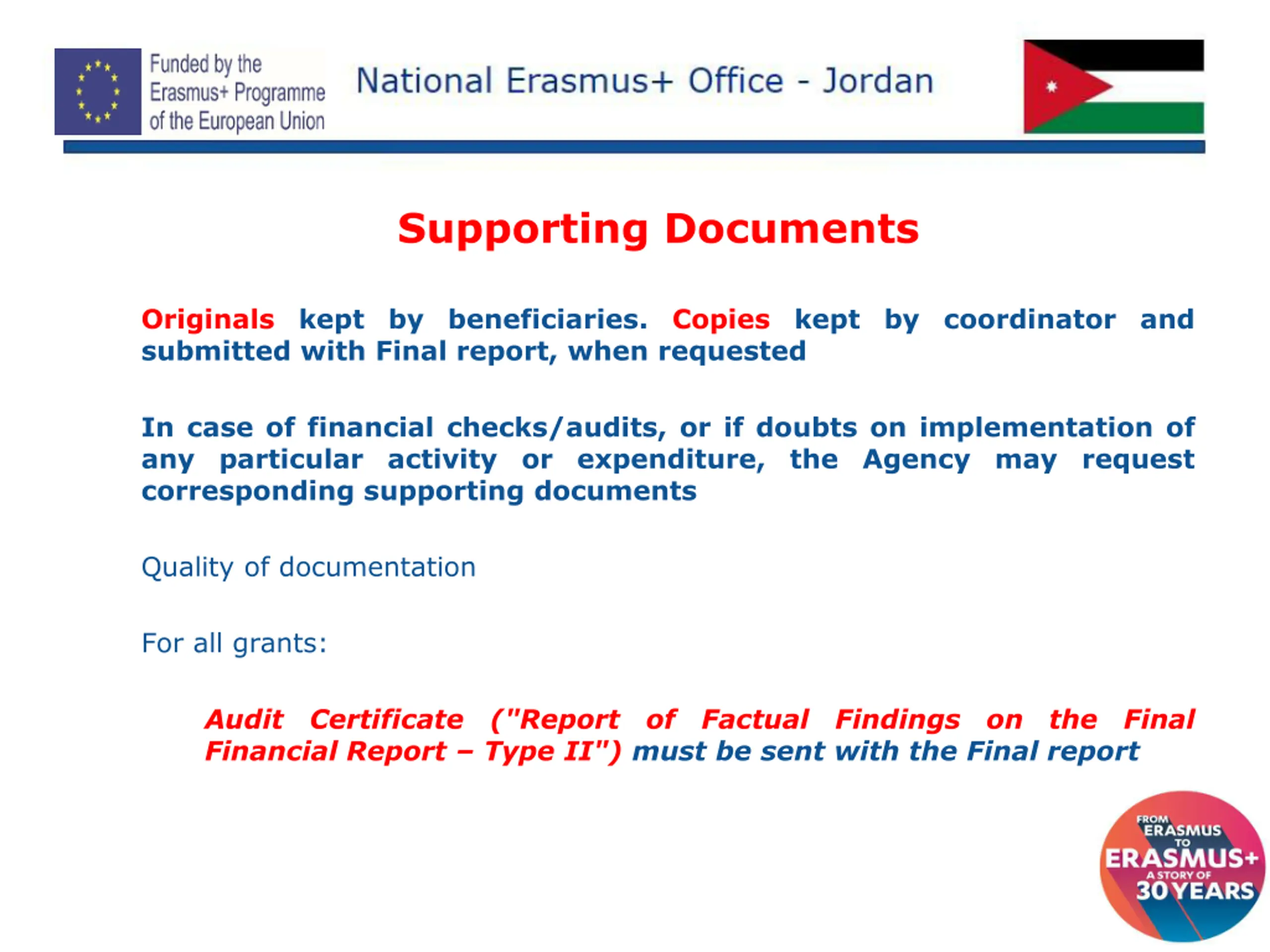Supporting Documents Originals kept by beneficiaries. Copies kept by coordinator and submitted with Final report, when requested In case of financial checks/audits, or if doubts on implementation of any particular activity or expenditure, the Agency may request corresponding supporting documents Quality of documentation For all grants: Audit Certificate ("Report of Factual Findings on the Final Financial Report Type II") must be sent with the Final report 21
