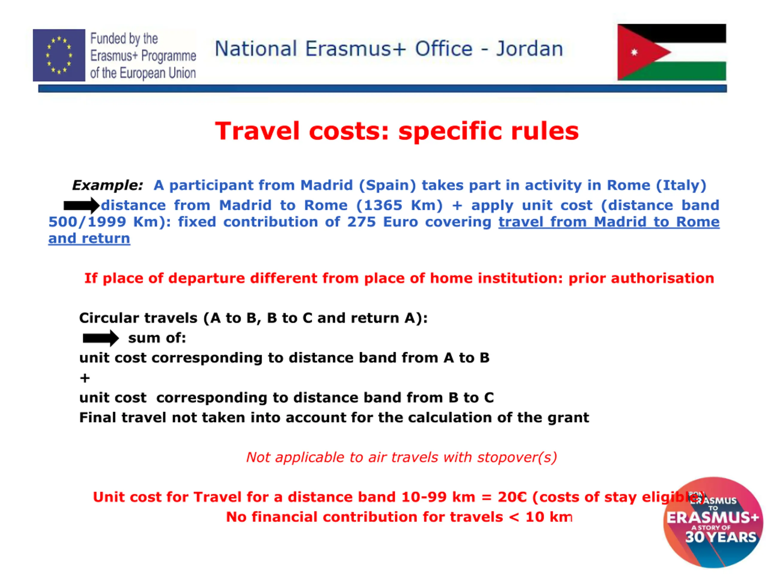 Travel costs: specific rules Example: A participant from Madrid (Spain) takes part in activity in Rome (Italy) distance from Madrid to Rome (1365 Km) + apply unit cost (distance band 500/1999 Km): fixed contribution of 275 Euro covering travel from Madrid to Rome and return If place of departure different from place of home institution: prior authorisation Circular travels (A to B, B to C and return A): sum of: unit cost corresponding to distance band from A to B + unit cost corresponding to distance band from B to C Final travel not taken into account for the calculation of the grant Not applicable to air travels with stopover(s) Unit cost for Travel for a distance band 10-99 km = 20 (costs of stay eligible) No financial contribution for travels < 10 km18