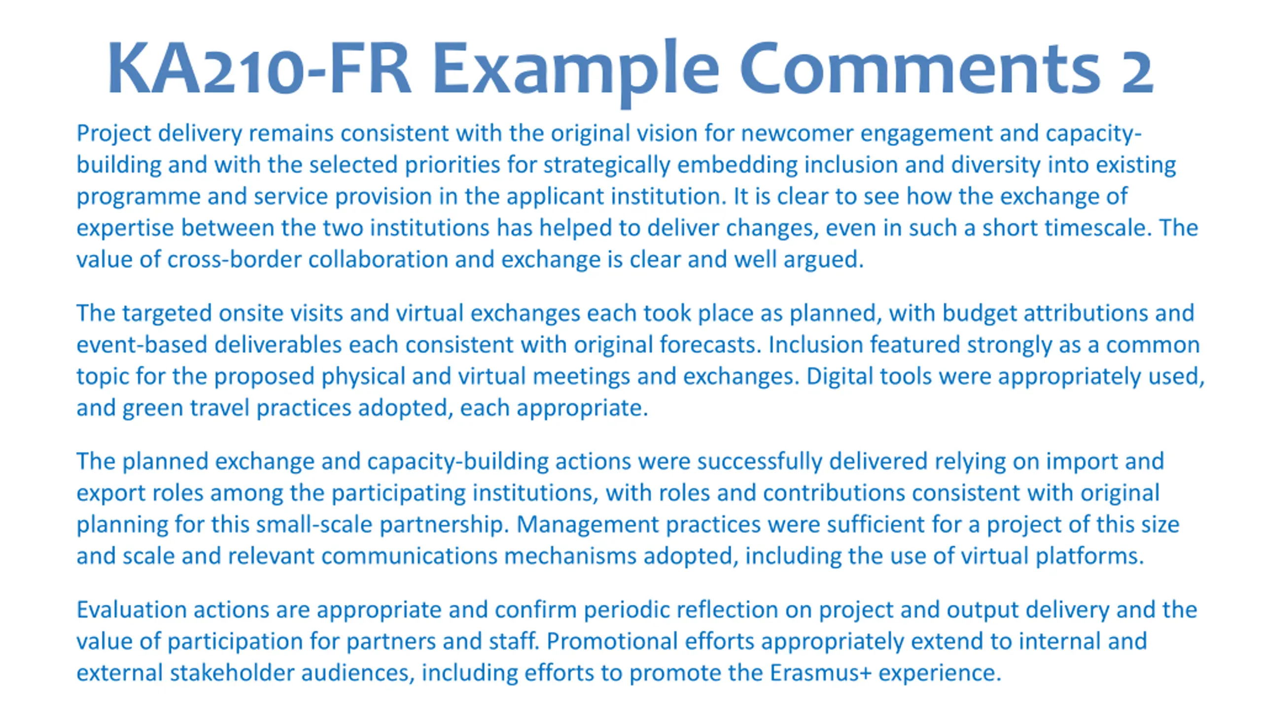 KA210-FR Example Comments 2 Project delivery remains consistent with the original vision for newcomer engagement and capacity- building and with the selected priorities for strategically embedding inclusion and diversity into existing programme and service provision in the applicant institution. It is clear to see how the exchange of expertise between the two institutions has helped to deliver changes, even in such a short timescale. The value of cross-border collaboration and exchange is clear and well argued. The targeted onsite visits and virtual exchanges each took place as planned, with budget attributions and event-based deliverables each consistent with original forecasts. Inclusion featured strongly as a common topic for the proposed physical and virtual meetings and exchanges. Digital tools were appropriately used, and green travel practices adopted, each appropriate. The planned exchange and capacity-building actions were successfully delivered relying on import and export roles among the participating institutions, with roles and contributions consistent with original planning for this small-scale partnership. Management practices were sufficient for a project of this size and scale and relevant communications mechanisms adopted, including the use of virtual platforms. Evaluation actions are appropriate and confirm periodic reflection on project and output delivery and the value of participation for partners and staff. Promotional efforts appropriately extend to internal and external stakeholder audiences, including efforts to promote the Erasmus+ experience.