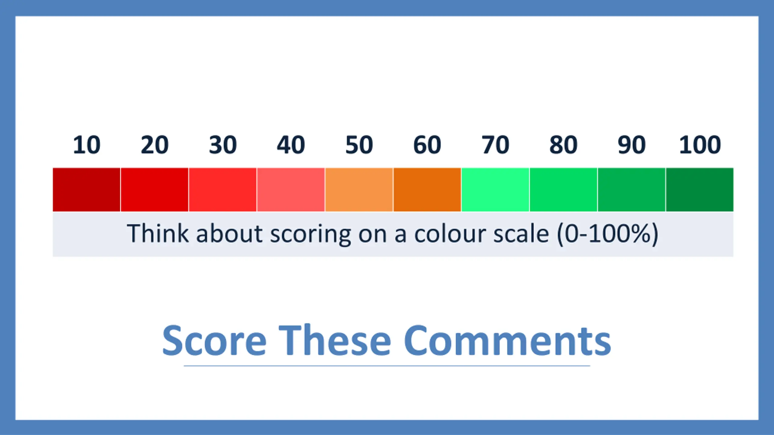 10 20 30 40 50 60 70 80 90 100 Think about scoring on a colour scale (0-100%) Score These Comments