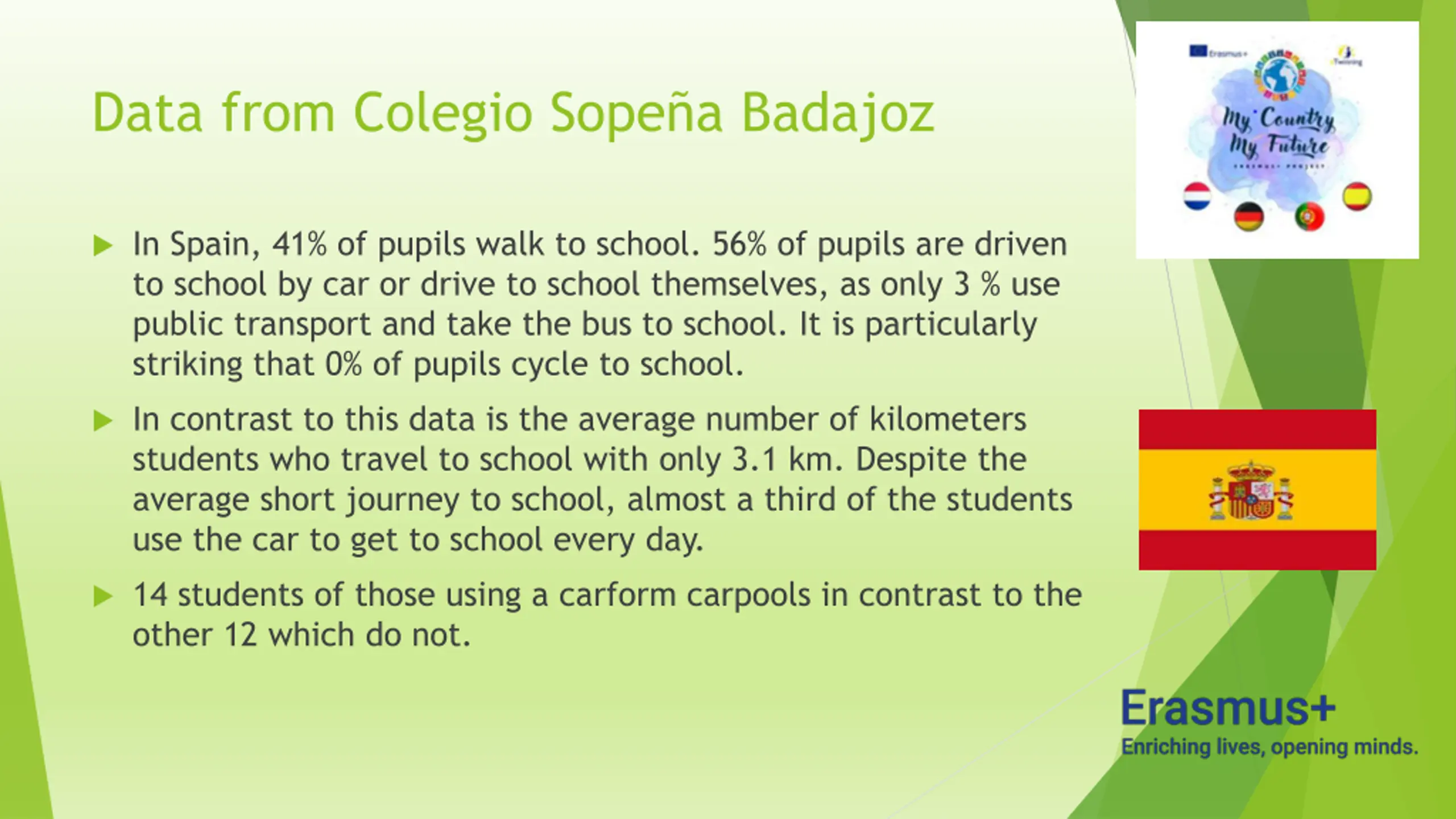 Data from Colegio Sopea Badajoz In Spain, 41% of pupils walk to school. 56% of pupils are driven to school by car or drive to school themselves, as only 3 % use public transport and take the bus to school. It is particularly striking that 0% of pupils cycle to school. In contrast to this data is the average number of kilometers students who travel to school with only 3.1 km. Despite the average short journey to school, almost a third of the students use the car to get to school every day. 14 students of those using a carform carpools in contrast to the other 12 which do not.