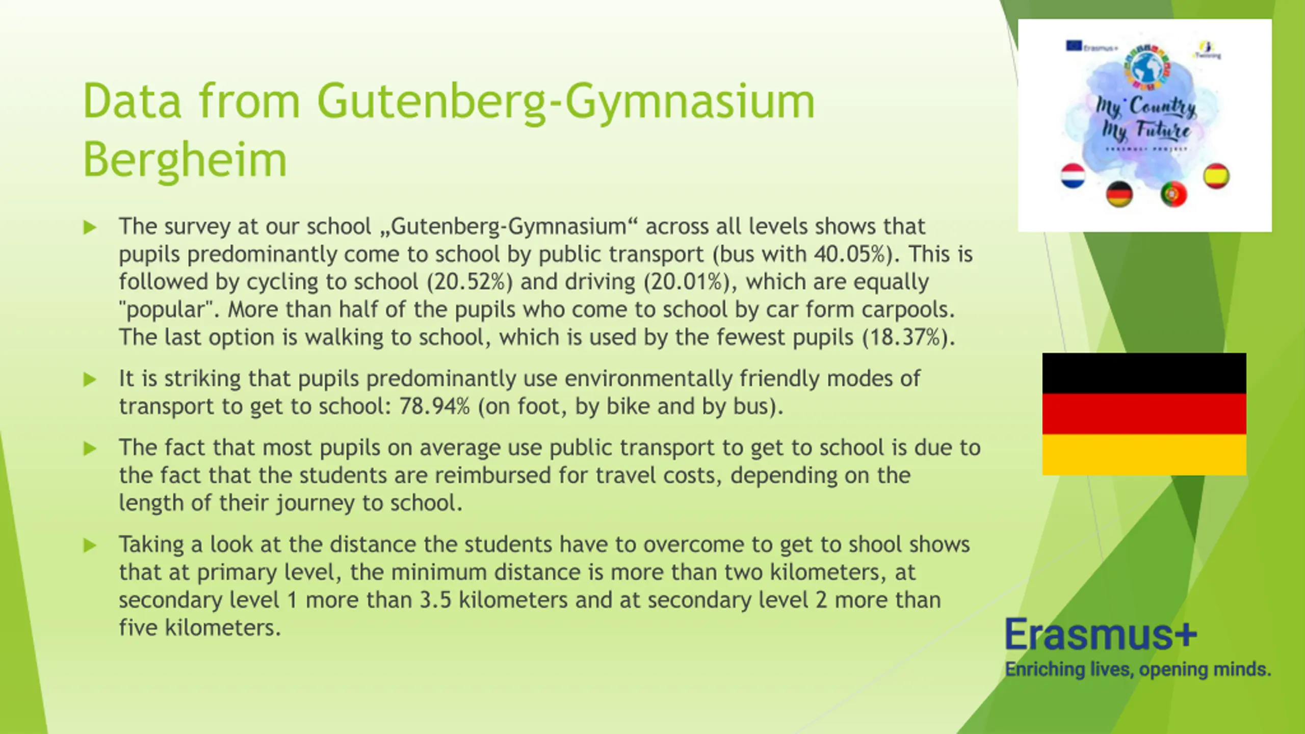Data from Gutenberg-Gymnasium Bergheim mainly public transport (40%, bus) bike and car are aproximately at thze same percentage (bike: 20,25%; car: 20,01%) More than 50 percent get to school by carpooling Walking to school ist the least liked way to get to school reaching only 18,37% The average way to school has 4,8km
