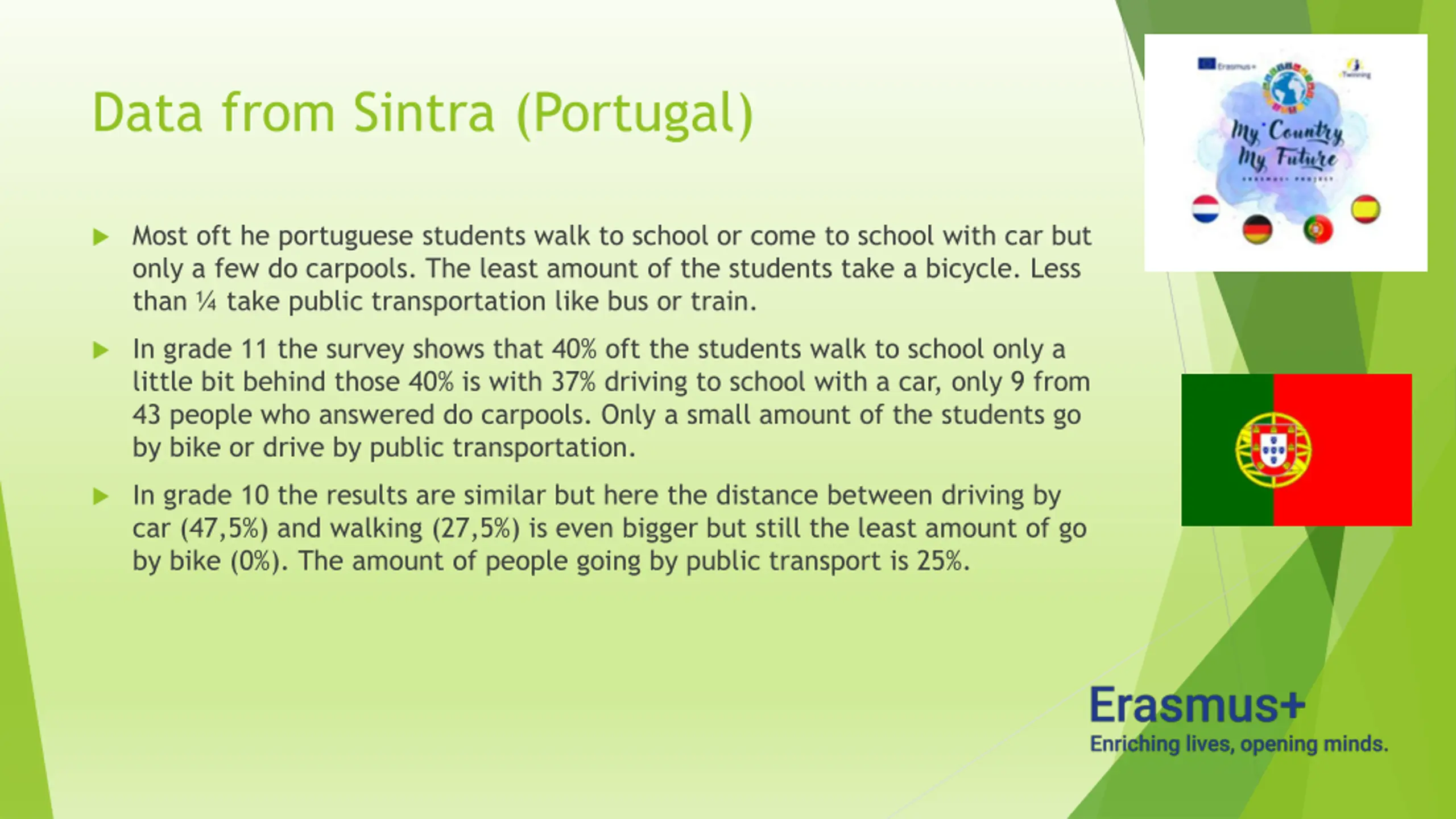 Data from Sintra (Portugal) Most oft he portuguese students walk to school or come to school with car but only a few do carpools. The least amount of the students take a bicycle. Less than take public transportation like bus or train. In grade 11 the survey shows that 40% oft the students walk to school only a little bit behind those 40% is with 37% driving to school with a car, only 9 from 43 people who answered do carpools. Only a small amount of the students go by bike or drive by public transportation. In grade 10 the results are similar but here the distance between driving by car (47,5%) and walking (27,5%) is even bigger but still the least amount of go by bike (0%). The amount of people going by public transport is 25%.