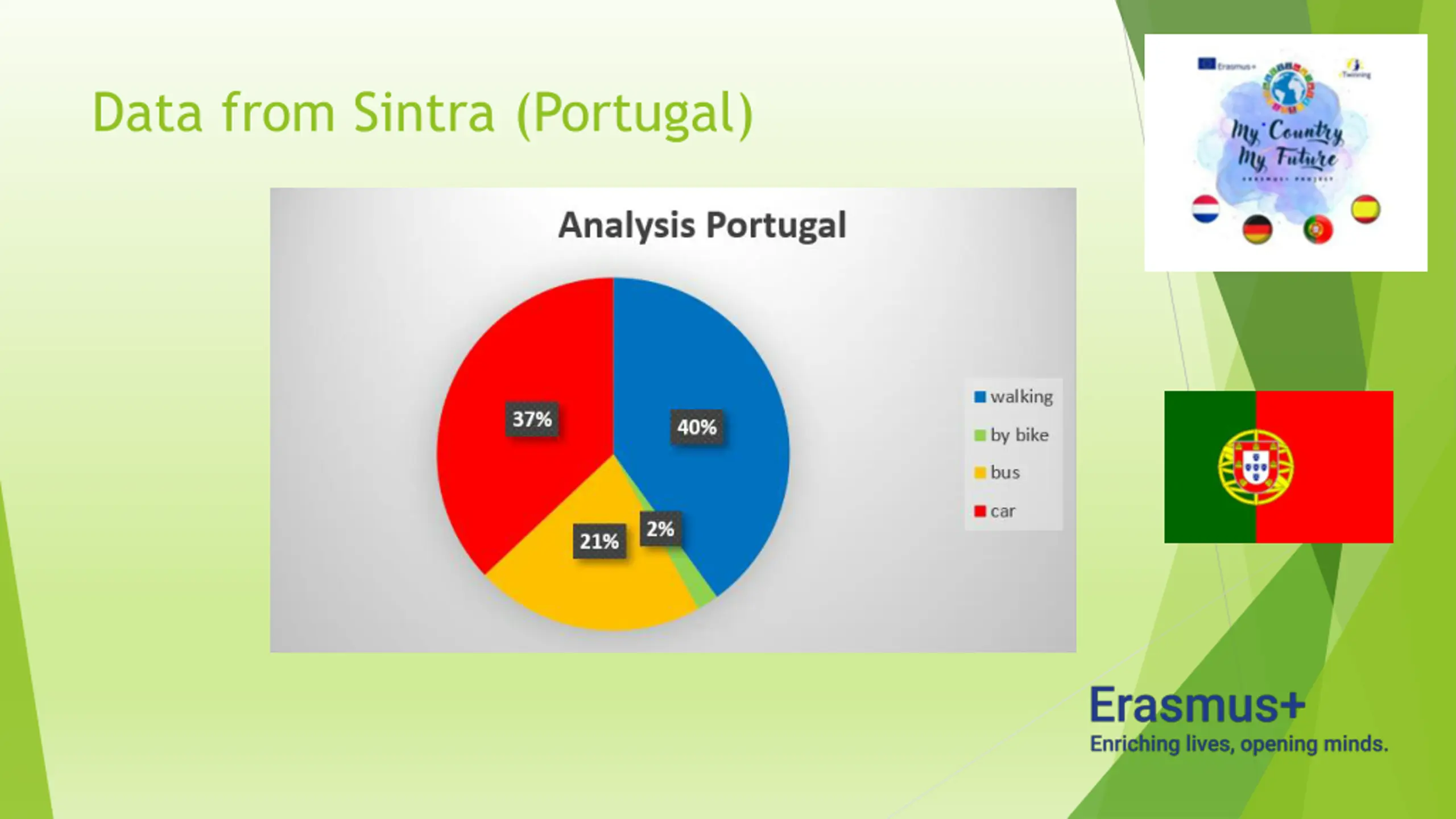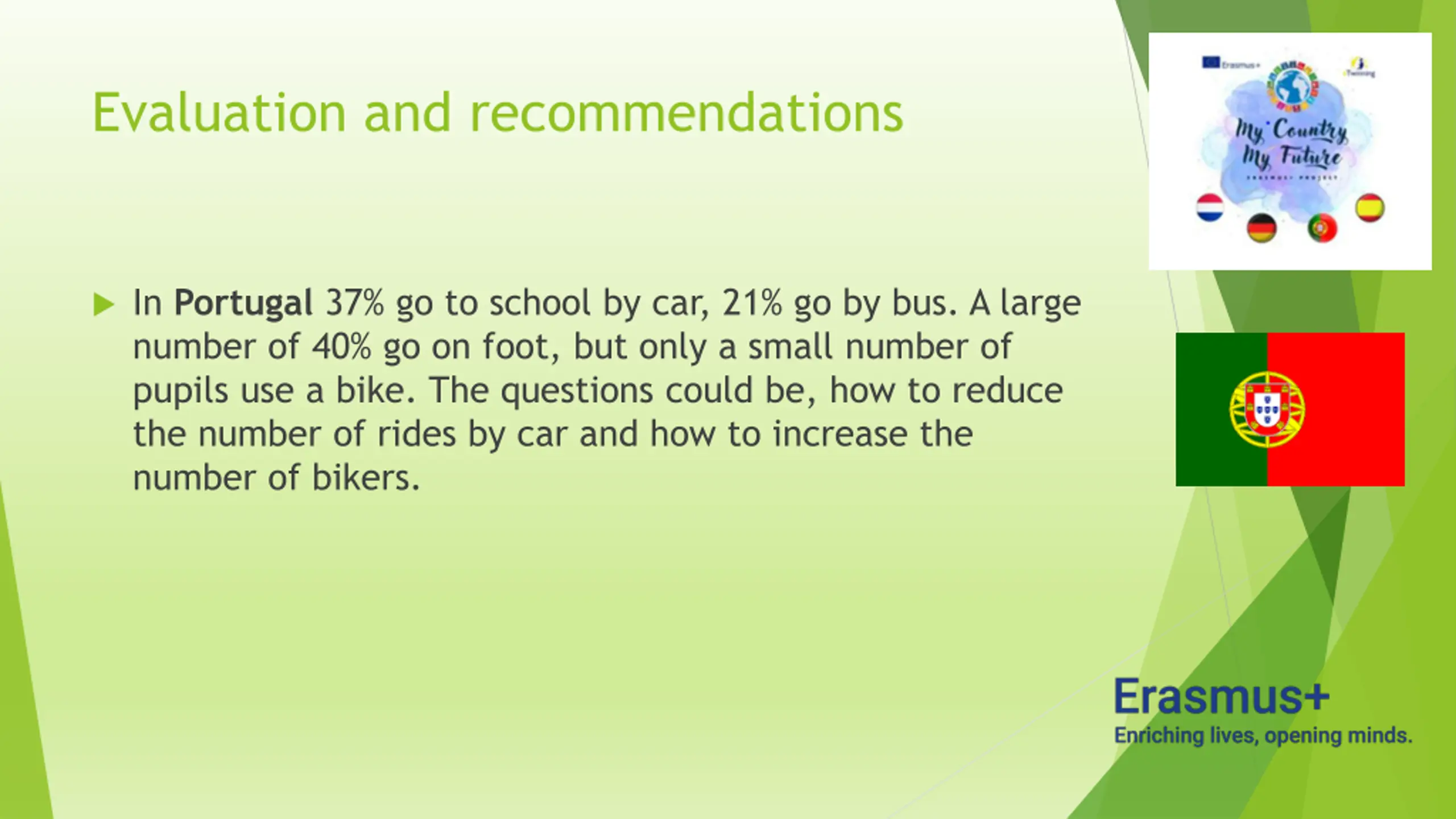 Evaluation and recommendations In Portugal 37% go to school by car, 21% go by bus. A large number of 40% go on foot, but only a small number of pupils use a bike. The questions could be, how to reduce the number of rides by car and how to increase the number of bikers.