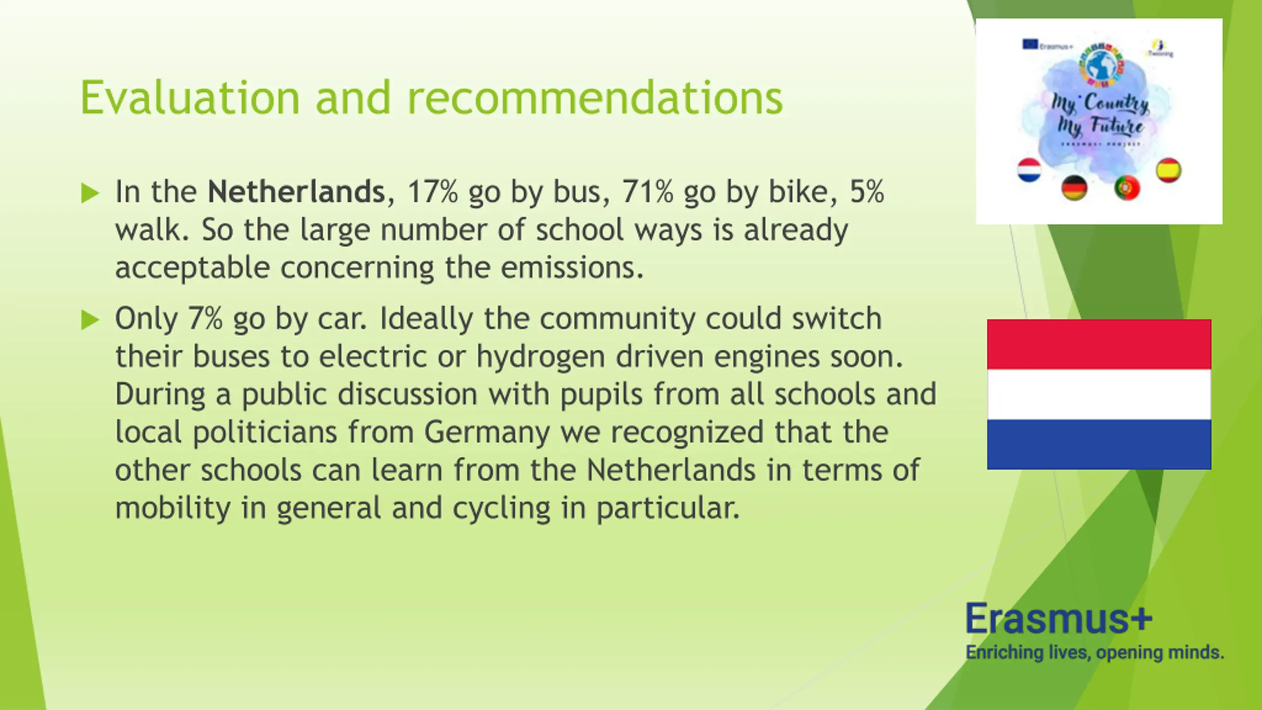 Evaluation and recommendations In the Netherlands, 17% go by bus, 71% go by bike, 5% walk. So the large number of school ways is already acceptable concerning the emissions. Only 7% go by car. Ideally the community could switch their buses to electric or hydrogen driven engines soon. During a public discussion with pupils from all schools and local politicians from Germany we recognized that the other schools can learn from the Netherlands in terms of mobility in general and cycling in particular.