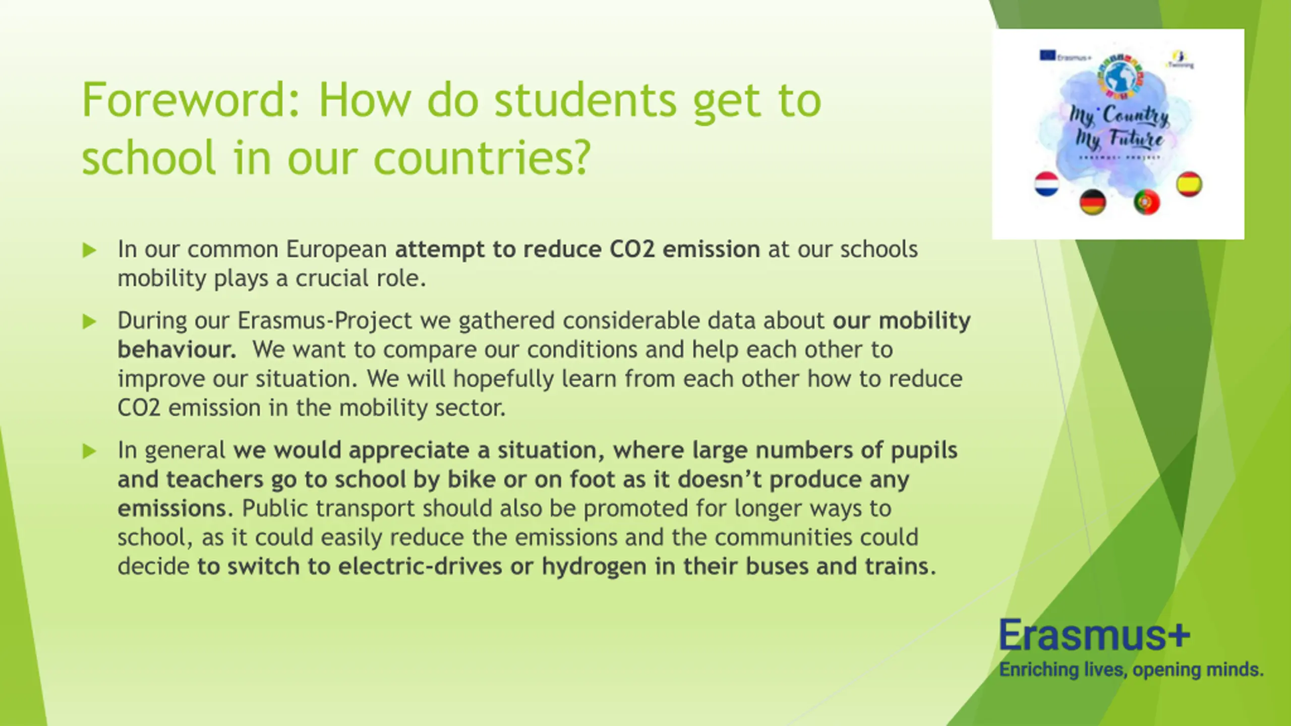 Foreword: How do students get to school in our countries? In our common European attempt to reduce CO2 emission at our schools mobility plays a crucial role. During our Erasmus-Project we gathered considerable data about our mobility behaviour. We want to compare our conditions and help each other to improve our situation. We will hopefully learn from each other how to reduce CO2 emission in the mobility sector. In general we would appreciate a situation, where large numbers of pupils and teachers go to school by bike or on foot as it doesn t produce any emissions. Public transport should also be promoted for longer ways to school, as it could easily reduce the emissions and the communities could decide to switch to electric-drives or hydrogen in their buses and trains.