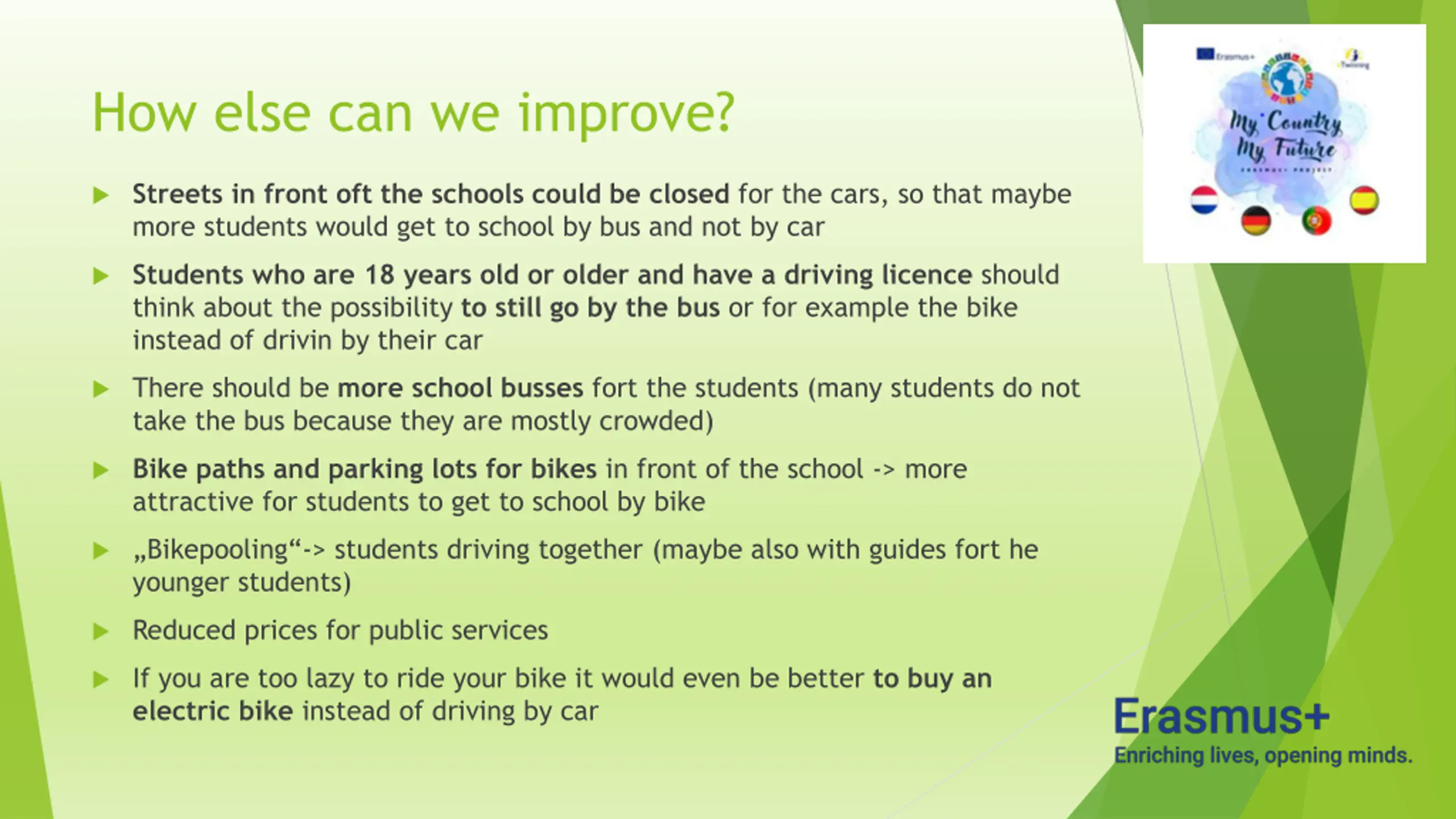 How else can we improve? Streets in front oft the schools could be closed for the cars, so that maybe more students would get to school by bus and not by car Students who are 18 years old or older and have a driving licence should think about the possibility to still go by the bus or for example the bike instead of drivin by their car There should be more school busses fort the students (many students do not take the bus because they are mostly crowded) Bike paths and parking lots for bikes in front of the school -> more attractive for students to get to school by bike Bikepooling -> students driving together (maybe also with guides fort he younger students) Reduced prices for public services If you are too lazy to ride your bike it would even be better to buy an electric bike instead of driving by car