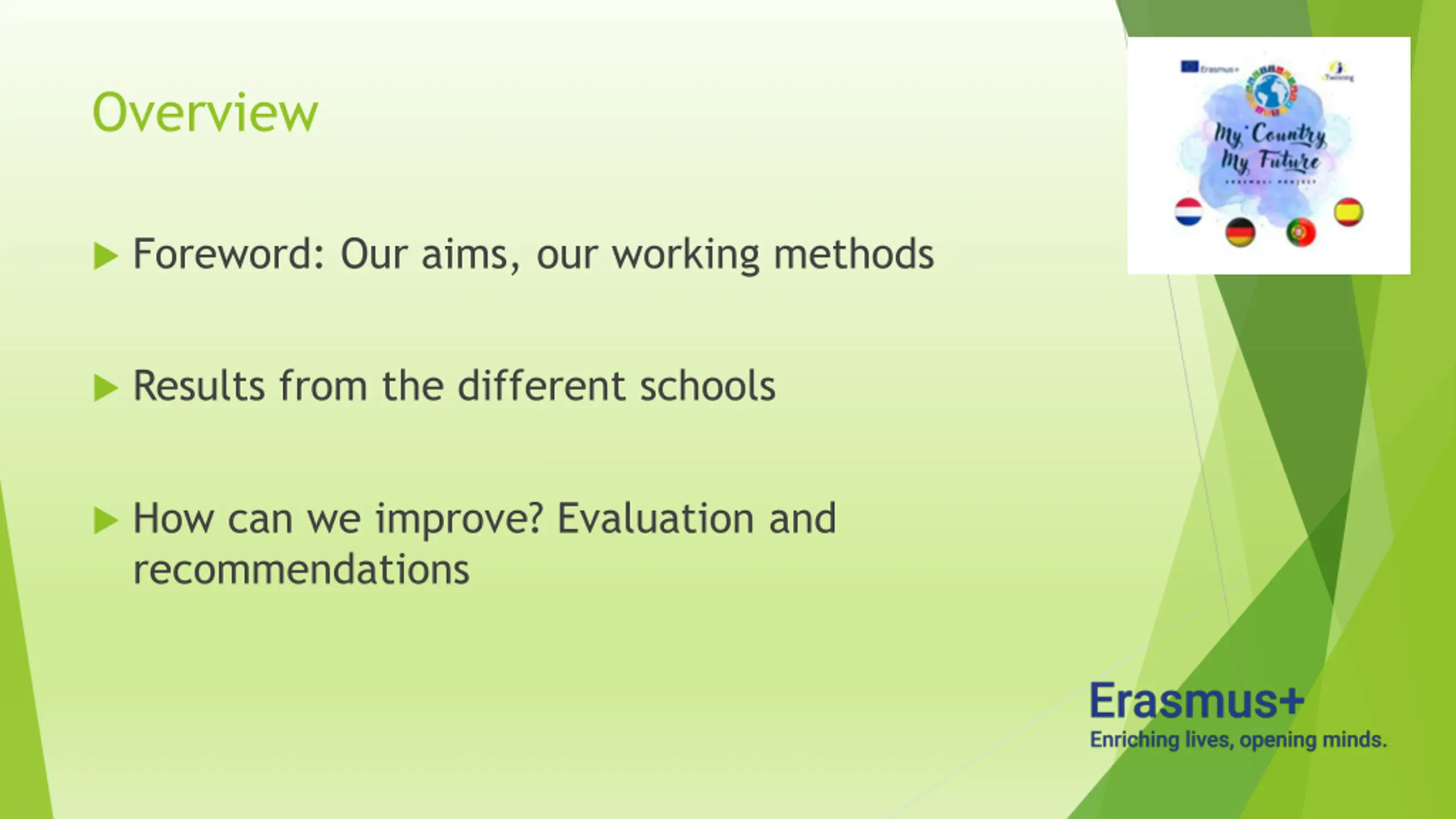 Overview Foreword: Our aims, our working methods Results from the different schools How can we improve? Evaluation and recommendations