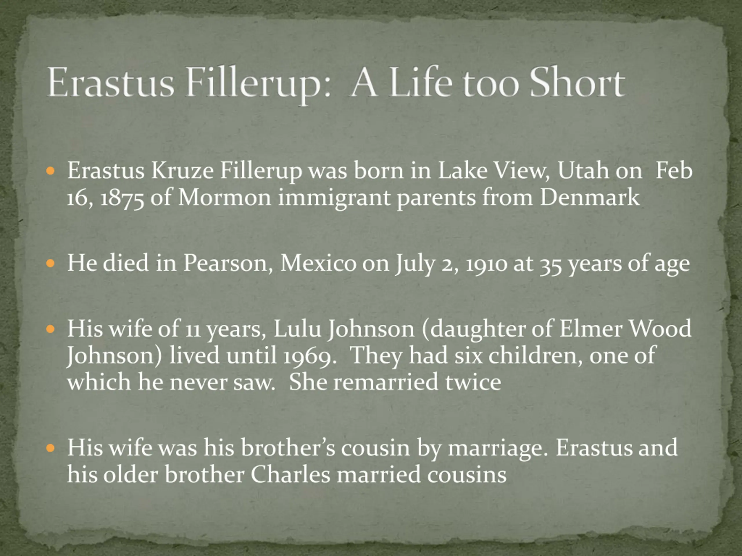 Erastus Fillerup: A Life too Short Erastus Kruze Fillerup was born in Lake View, Utah on Feb 16, 1875 of Mormon immigrant parents from Denmark He died in Pearson, Mexico on July 2, 1910 at 35 years of age His wife of 11 years, Lulu Johnson (daughter of Elmer Wood Johnson) lived until 1969. They had six children, one of which he never saw. She remarried twice His wife was his brother s cousin by marriage. Erastus and his older brother Charles married cousins