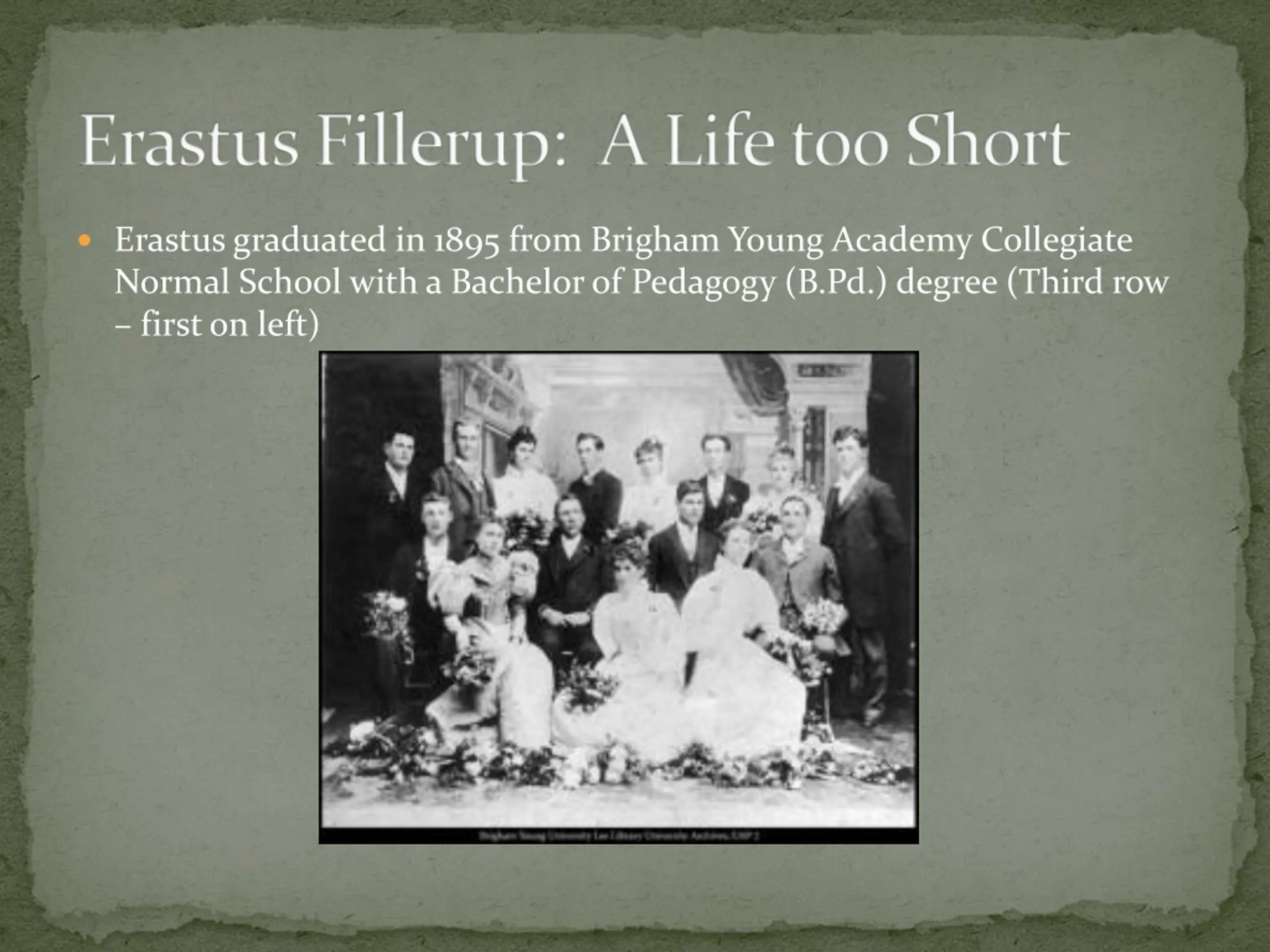 Erastus Fillerup: A Life too Short Erastus graduated in 1895 from Brigham Young Academy Collegiate Normal School with a Bachelor of Pedagogy (B.Pd.) degree (Third row first on left)