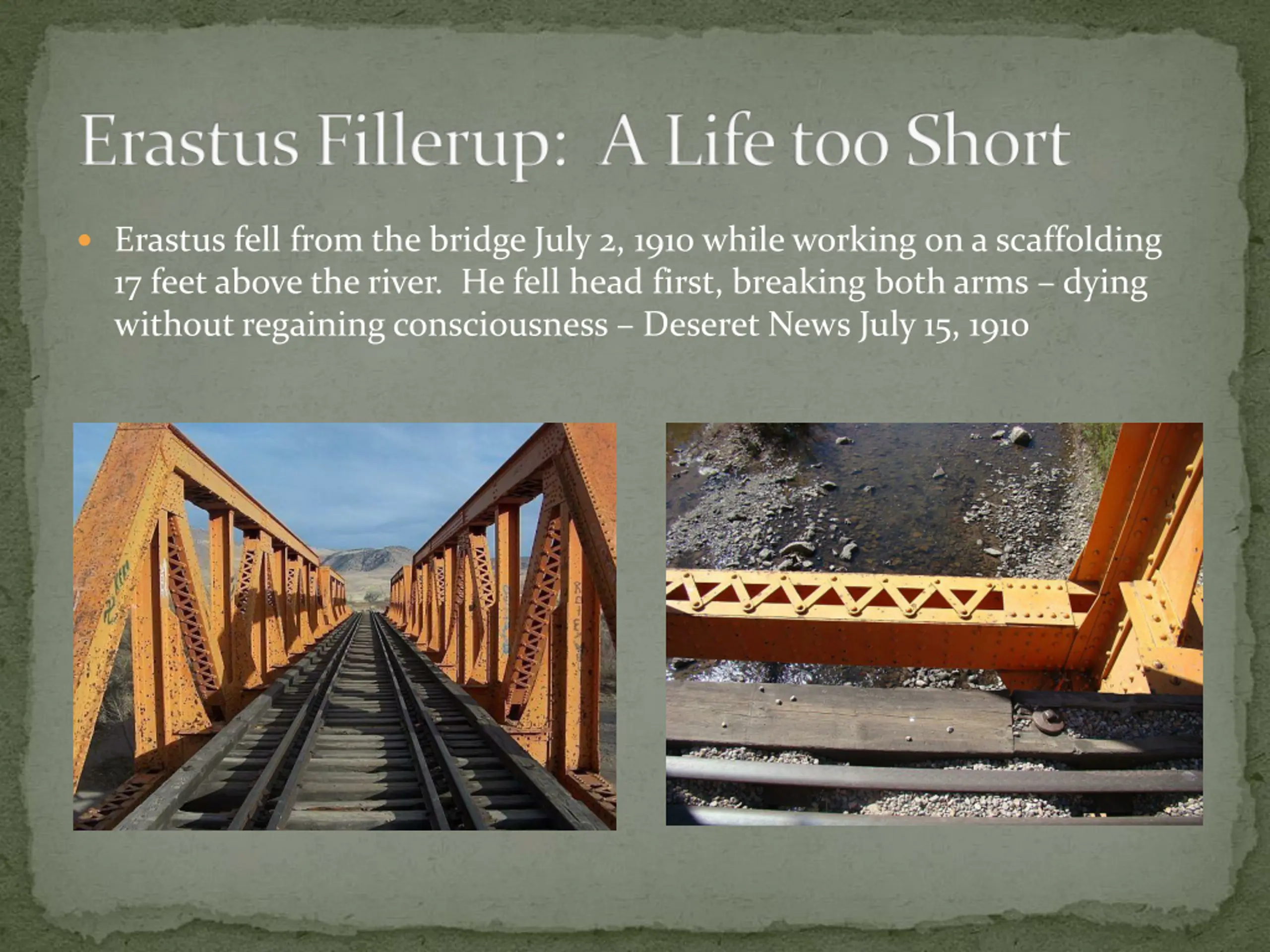 Erastus Fillerup: A Life too Short Erastus fell from the bridge July 2, 1910 while working on a scaffolding 17 feet above the river. He fell head first, breaking both arms dying without regaining consciousness Deseret News July 15, 1910