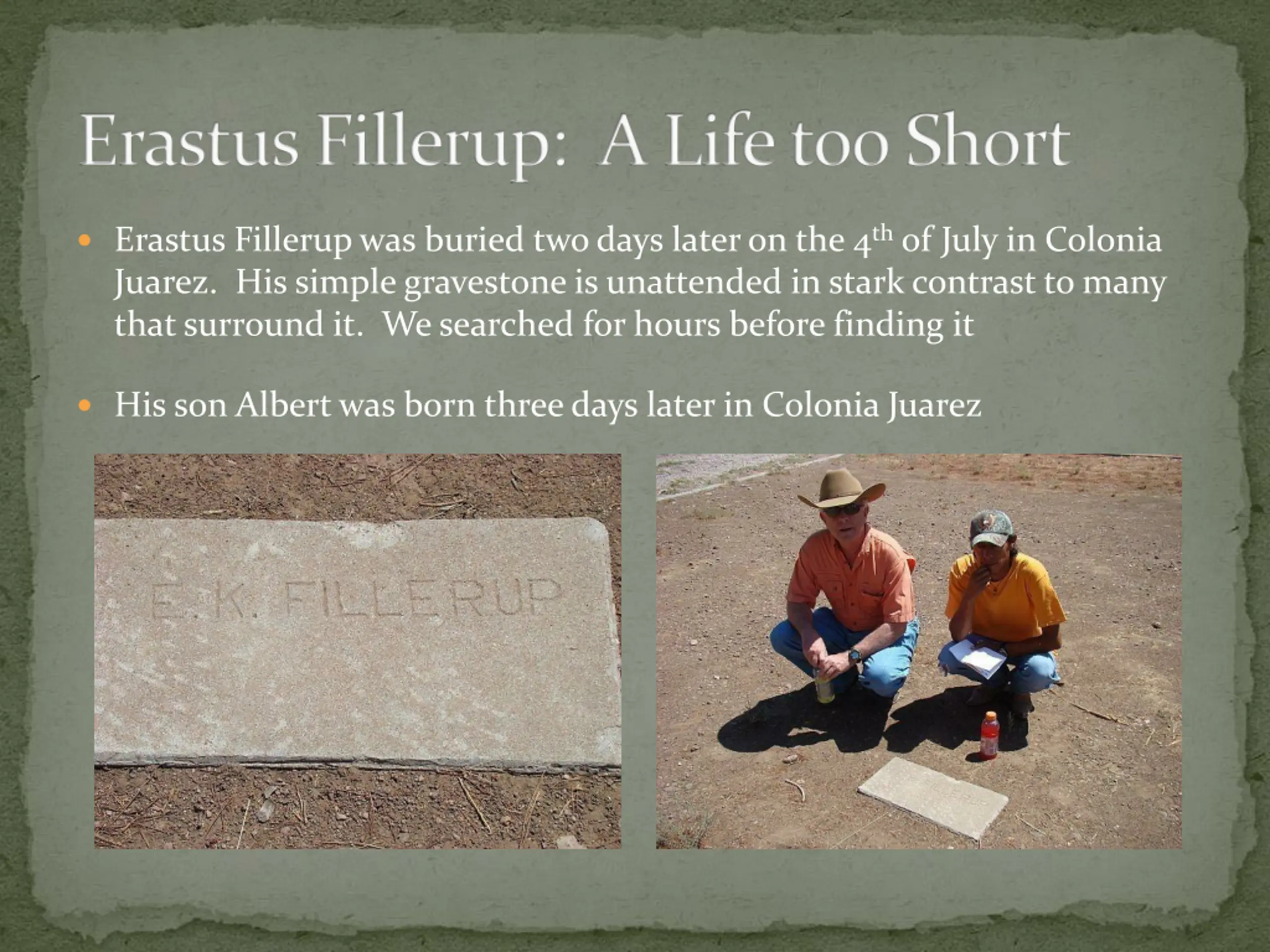 Erastus Fillerup: A Life too Short Erastus Fillerup was buried two days later on the 4thof July in Colonia Juarez. His simple gravestone is unattended in stark contrast to many that surround it. We searched for hours before finding it His son Albert was born three days later in Colonia Juarez