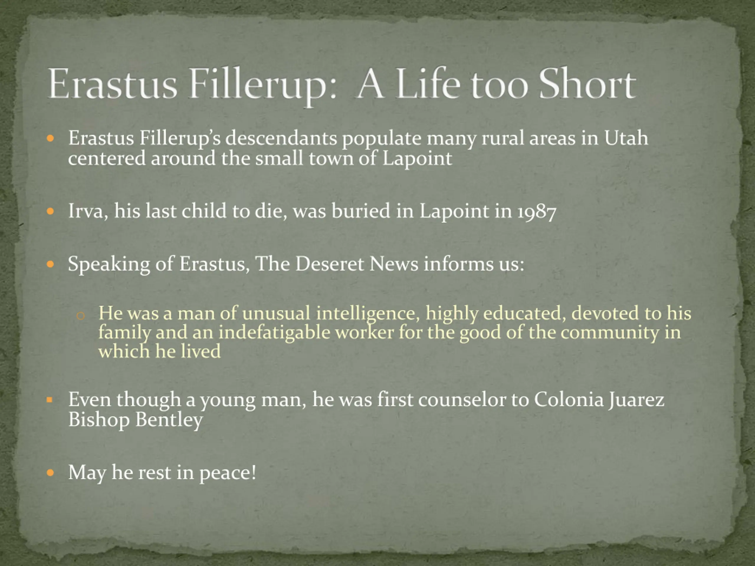 Erastus Fillerup: A Life too Short Erastus Fillerup s descendants populate many rural areas in Utah centered around the small town of Lapoint Irva, his last child to die, was buried in Lapoint in 1987 Speaking of Erastus, The Deseret News informs us: o He was a man of unusual intelligence, highly educated, devoted to his family and an indefatigable worker for the good of the community in which he lived Even though a young man, he was first counselor to Colonia Juarez Bishop Bentley May he rest in peace!