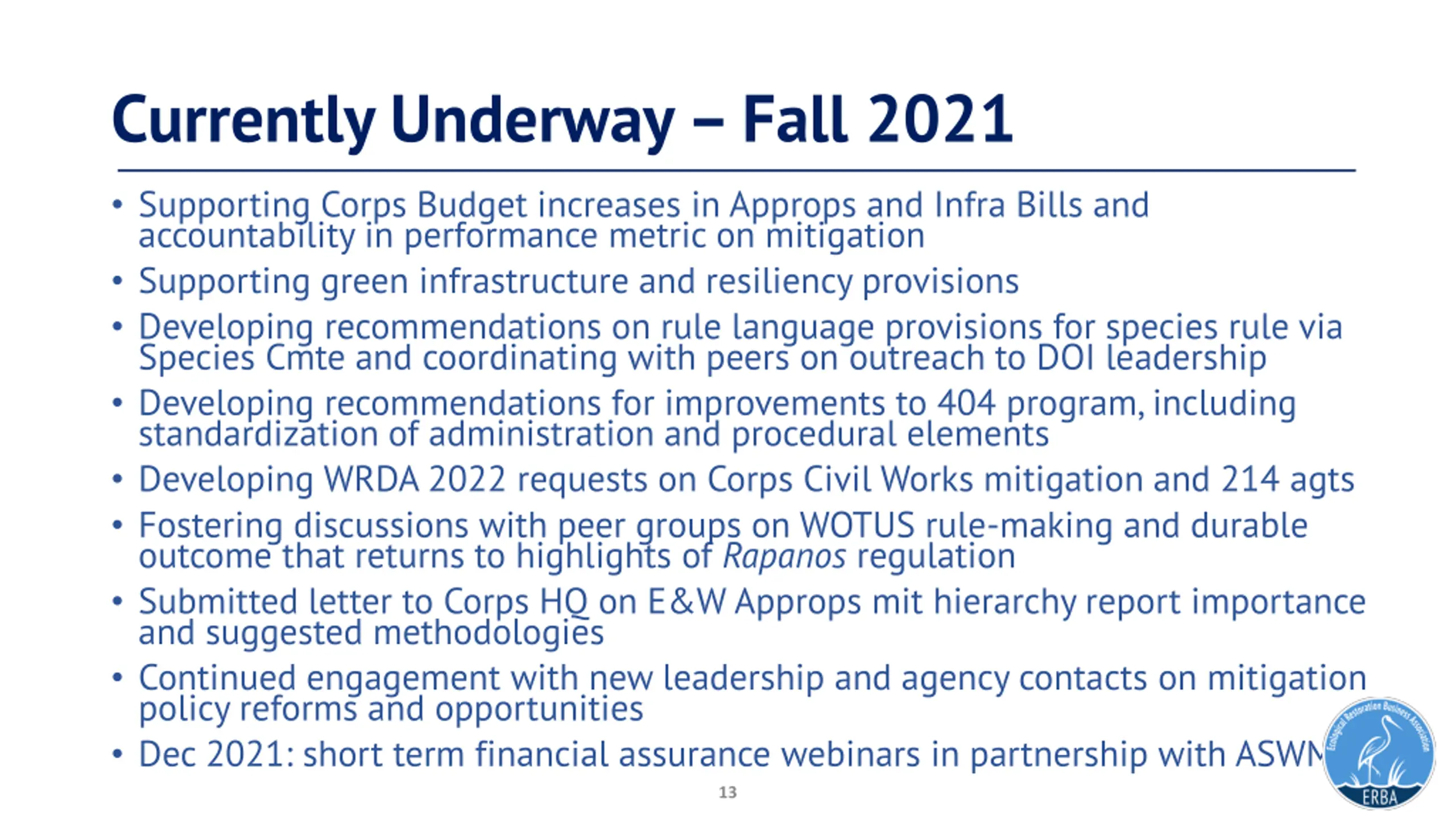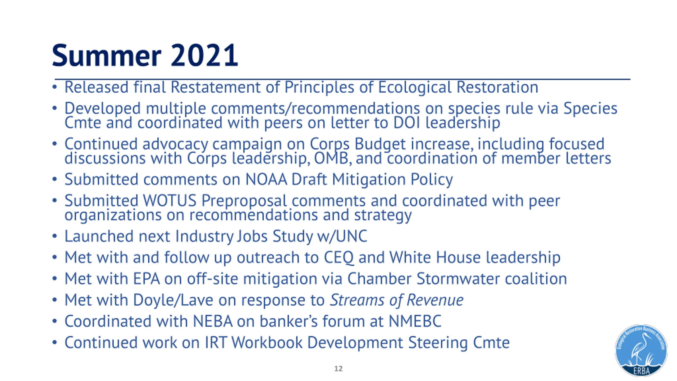 Summer 2021 Released final Restatement of Principles of Ecological Restoration Developed multiple comments/recommendations on species rule via Species Cmte and coordinated with peers on letter to DOI leadership Continued advocacy campaign on Corps Budget increase, including focused discussions with Corps leadership, OMB, and coordination of member letters Submitted comments on NOAA Draft Mitigation Policy Submitted WOTUS Preproposal comments and coordinated with peer organizations on recommendations and strategy Launched next Industry Jobs Study w/UNC Met with and follow up outreach to CEQ and White House leadership Met with EPA on off-site mitigation via Chamber Stormwater coalition Met with Doyle/Lave on response to Streams of Revenue Coordinated with NEBA on banker s forum at NMEBC Continued work on IRT Workbook Development Steering Cmte 12