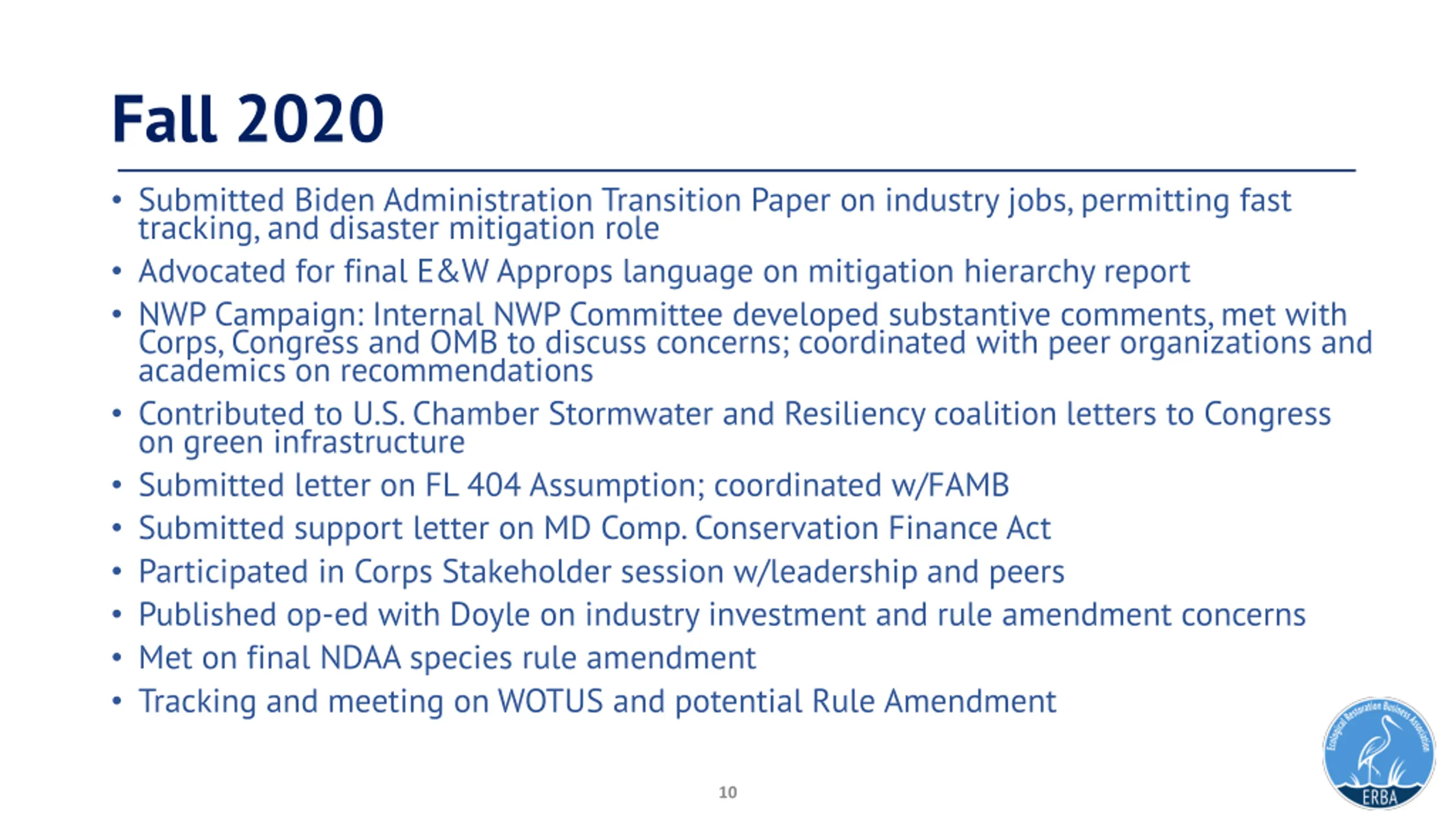 Fall 2020 Submitted Biden Administration Transition Paper on industry jobs, permitting fast tracking, and disaster mitigation role Advocated for final E&W Approps language on mitigation hierarchy report NWP Campaign: Internal NWP Committee developed substantive comments, met with Corps, Congress and OMB to discuss concerns; coordinated with peer organizations and academics on recommendations Contributed to U.S. Chamber Stormwater and Resiliency coalition letters to Congress on green infrastructure Submitted letter on FL 404 Assumption; coordinated w/FAMB Submitted support letter on MD Comp. Conservation Finance Act Participated in Corps Stakeholder session w/leadership and peers Published op-ed with Doyle on industry investment and rule amendment concerns Met on final NDAA species rule amendment Tracking and meeting on WOTUS and potential Rule Amendment 10