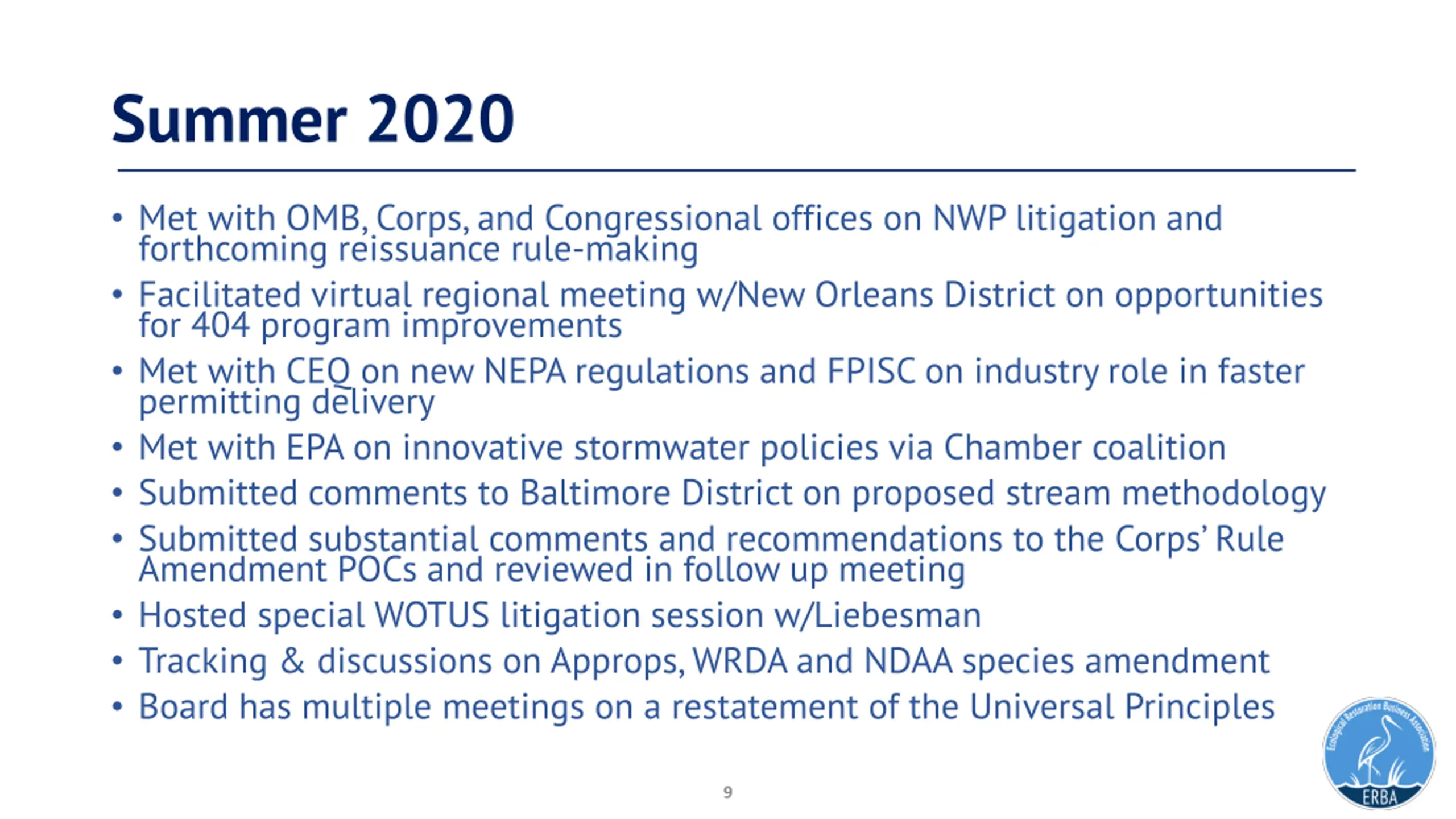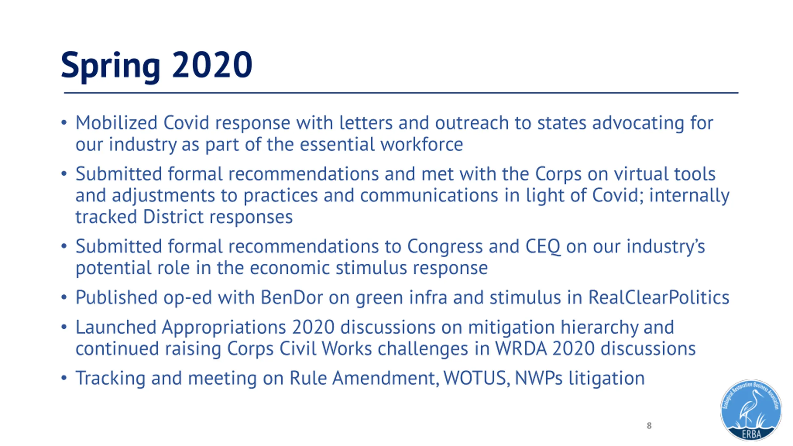 Spring 2020 Mobilized Covid response with letters and outreach to states advocating for our industry as part of the essential workforce Submitted formal recommendations and met with the Corps on virtual tools and adjustments to practices and communications in light of Covid; internally tracked District responses Submitted formal recommendations to Congress and CEQ on our industry s potential role in the economic stimulus response Published op-ed with BenDor on green infra and stimulus in RealClearPolitics Launched Appropriations 2020 discussions on mitigation hierarchy and continued raising Corps Civil Works challenges in WRDA 2020 discussions Tracking and meeting on Rule Amendment, WOTUS, NWPs litigation 8