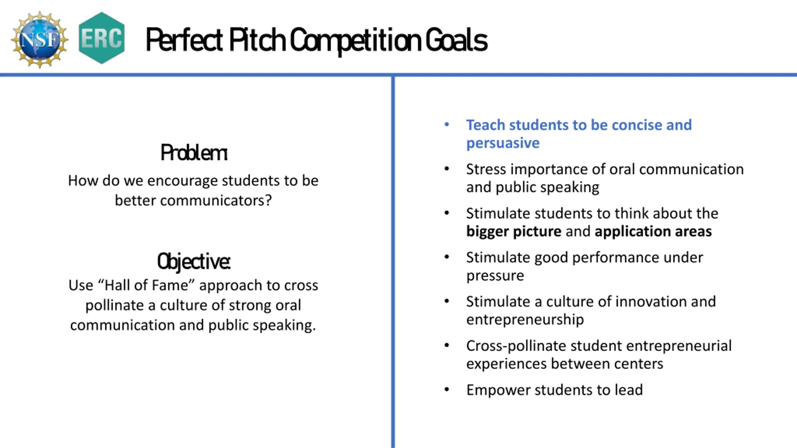 P erfect Pitch C om petition G oals Teach students to be concise and persuasive P roblem : Stress importance of oral communication and public speaking How do we encourage students to be better communicators? Stimulate students to think about the bigger picture and application areas Objective: Stimulate good performance under pressure Use Hall of Fame approach to cross pollinate a culture of strong oral communication and public speaking. Stimulate a culture of innovation and entrepreneurship Cross-pollinate student entrepreneurial experiences between centers Empower students to lead