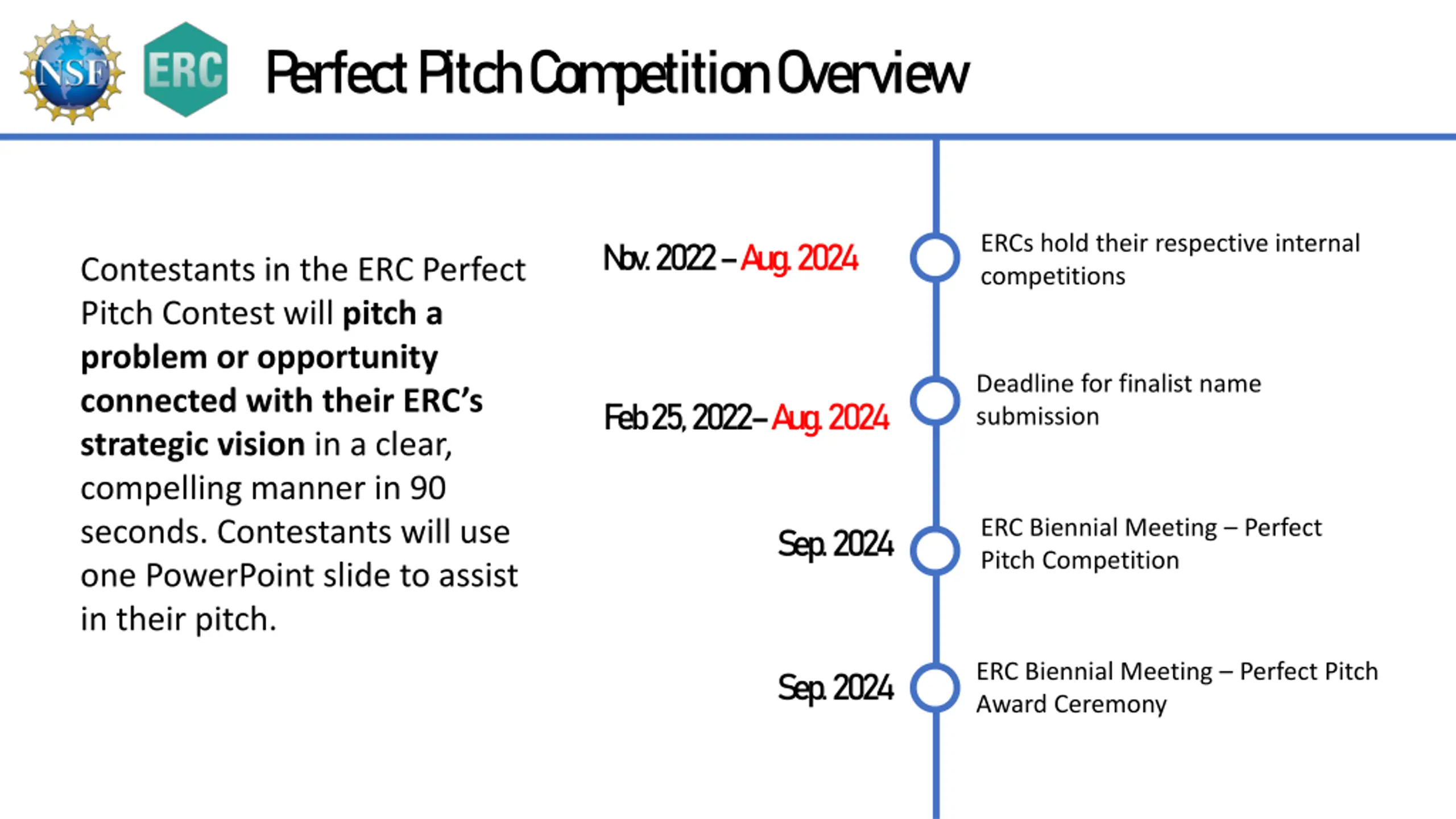 P erfect Pitch C om petition O verview ERCs hold their respective internal competitions N ov. 2022 A ug. 2024 Contestants in the ERC Perfect Pitch Contest will pitch a problem or opportunity connected with their ERC s strategic vision in a clear, compelling manner in 90 seconds. Contestants will use one PowerPoint slide to assist in their pitch. Deadline for finalist name submission Feb 25, 2022 A ug. 2024 ERC Biennial Meeting Perfect Pitch Competition Sep. 2024 ERC Biennial Meeting Perfect Pitch Award Ceremony Sep. 2024