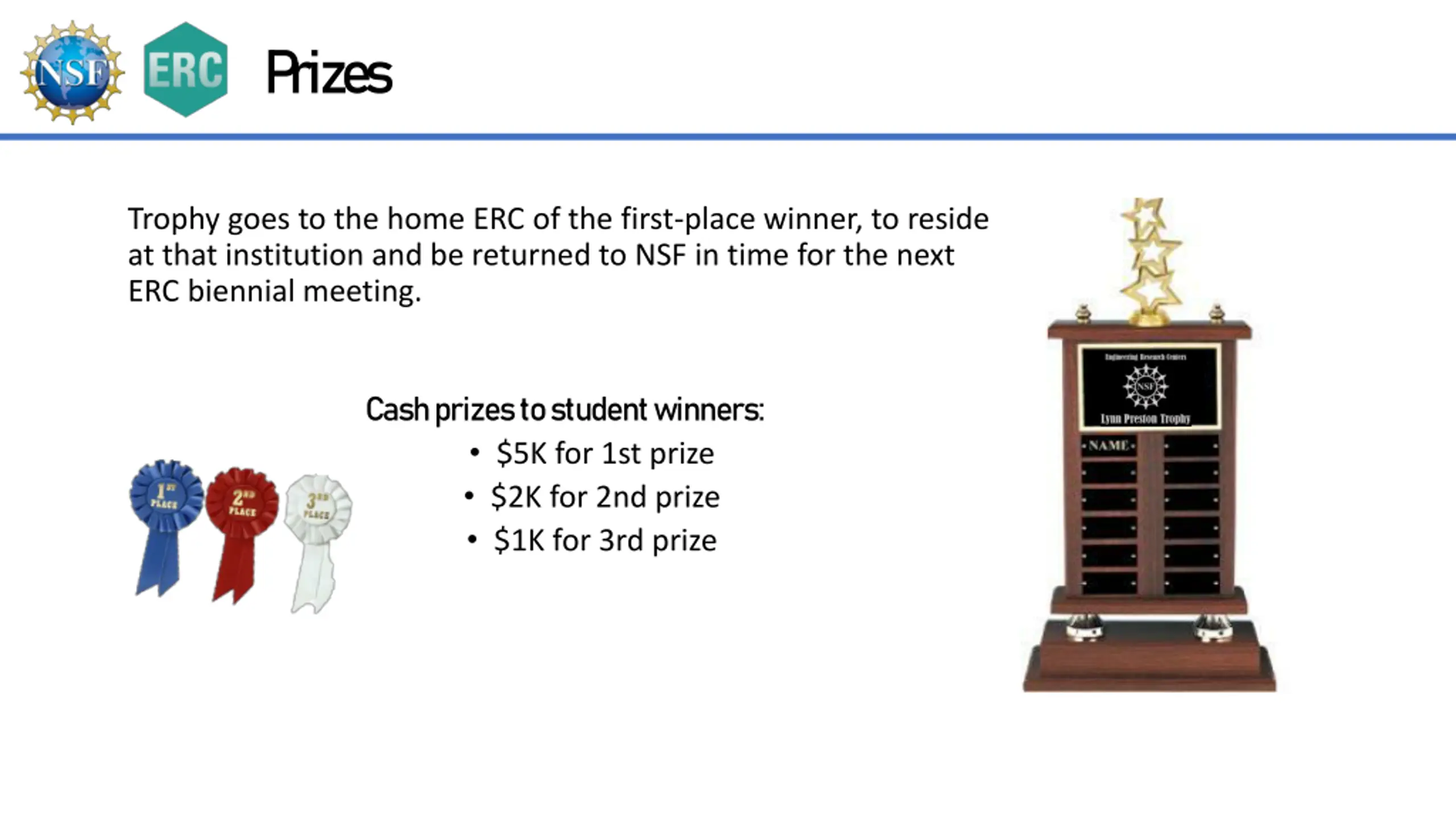 P rizes Trophy goes to the home ERC of the first-place winner, to reside at that institution and be returned to NSF in time for the next ERC biennial meeting. Cash prizes to student winners: $5K for 1st prize $2K for 2nd prize $1K for 3rd prize