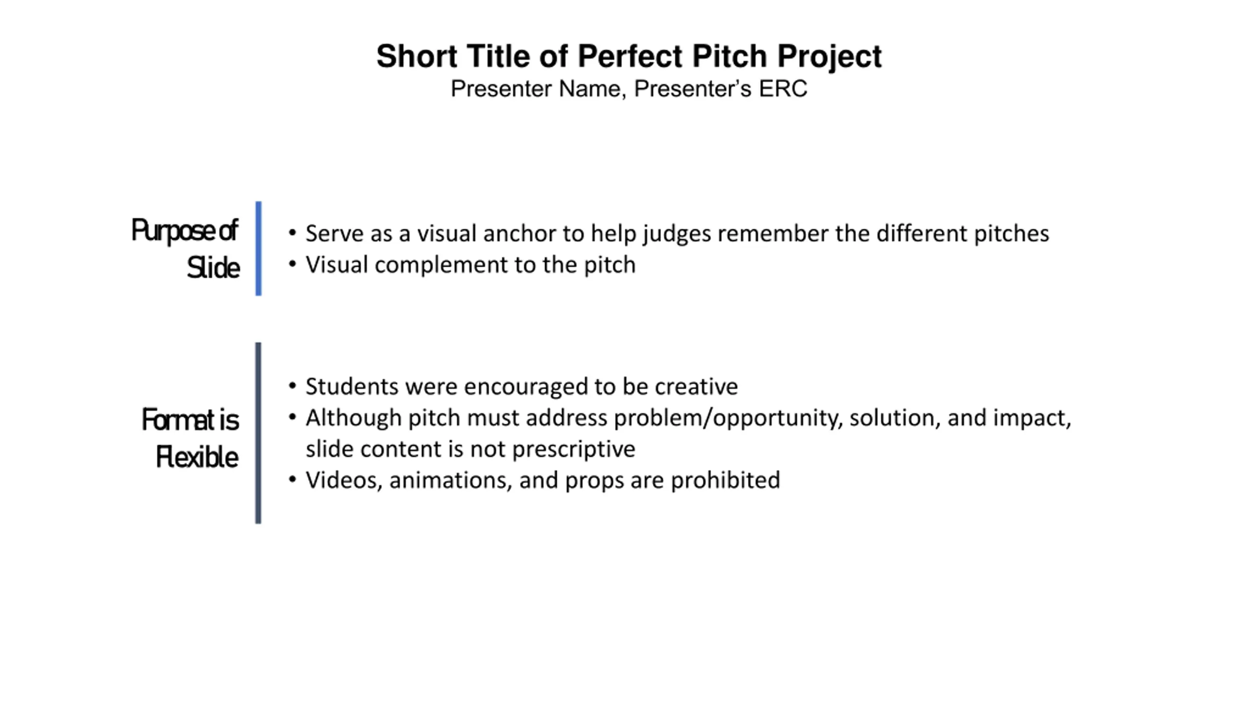 Short Title of Perfect Pitch Project Presenter Name, Presenter s ERC P urpose of Slide Serve as a visual anchor to help judges remember the different pitches Visual complement to the pitch Students were encouraged to be creative Although pitch must address problem/opportunity, solution, and impact, slide content is not prescriptive Videos, animations, and props are prohibited Form at is Flexible