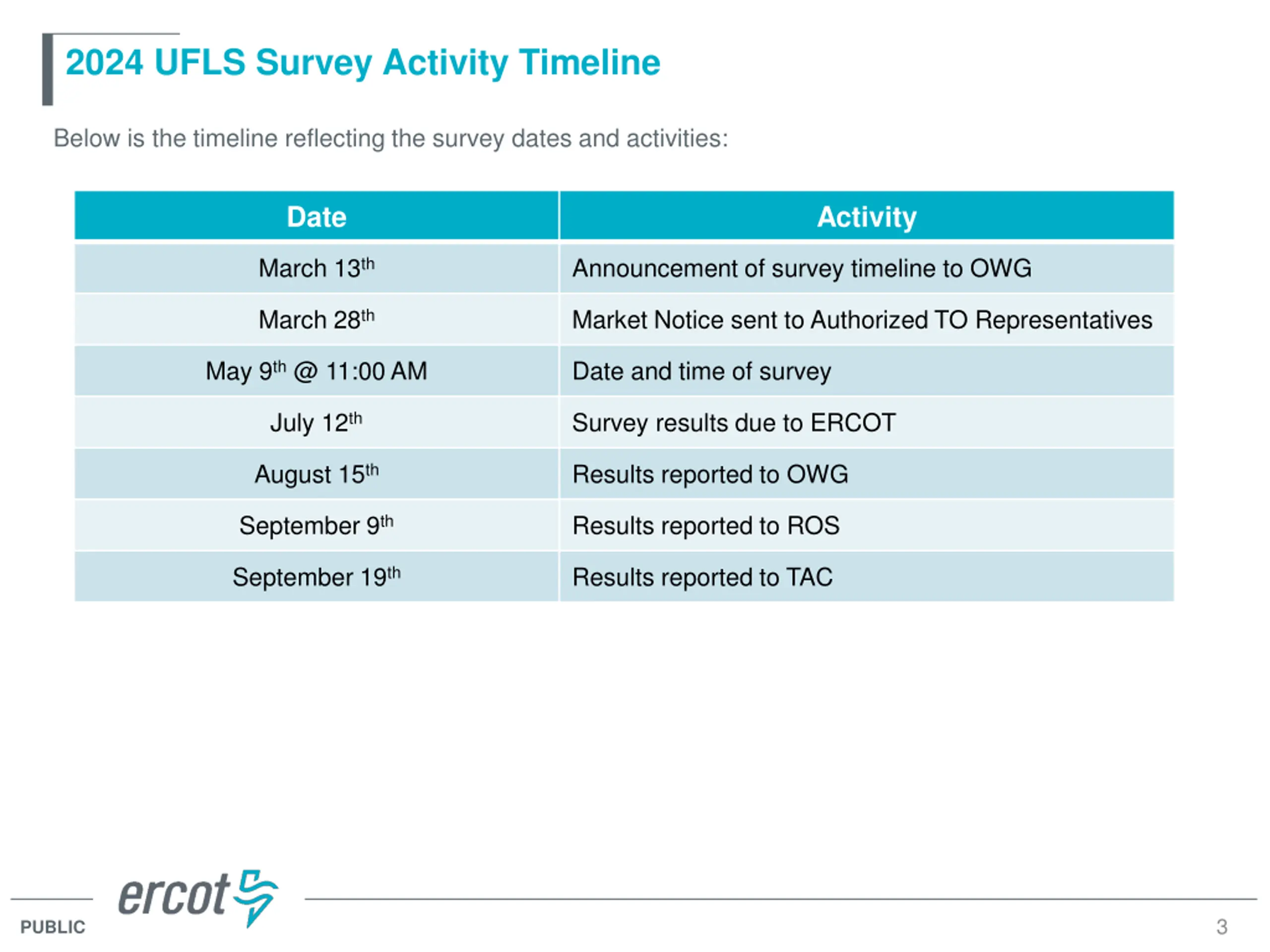 2024 UFLS Survey Activity Timeline Below is the timeline reflecting the survey dates and activities: Date Activity March 13th Announcement of survey timeline to OWG March 28th Market Notice sent to Authorized TO Representatives May 9th @ 11:00 AM Date and time of survey July 12th Survey results due to ERCOT August 15th Results reported to OWG September 9th Results reported to ROS September 19th Results reported to TAC 3 PUBLIC