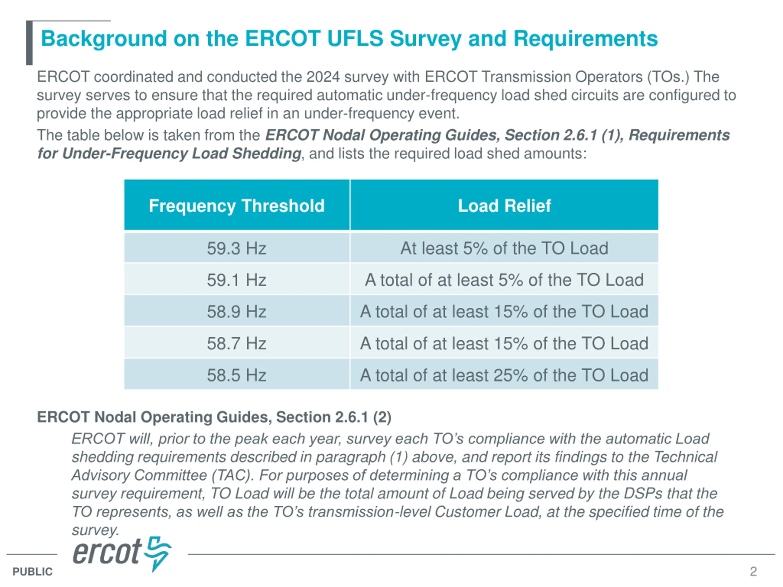 Background on the ERCOT UFLS Survey and Requirements ERCOT coordinated and conducted the 2024 survey with ERCOT Transmission Operators (TOs.) The survey serves to ensure that the required automatic under-frequency load shed circuits are configured to provide the appropriate load relief in an under-frequency event. The table below is taken from the ERCOT Nodal Operating Guides, Section 2.6.1 (1), Requirements for Under-Frequency Load Shedding, and lists the required load shed amounts: Frequency Threshold Load Relief At least 5% of the TO Load 59.3 Hz A total of at least 5% of the TO Load 59.1 Hz A total of at least 15% of the TO Load 58.9 Hz 58.7 Hz A total of at least 15% of the TO Load 58.5 Hz A total of at least 25% of the TO Load ERCOT Nodal Operating Guides, Section 2.6.1 (2) ERCOT will, prior to the peak each year, survey each TO s compliance with the automatic Load shedding requirements described in paragraph (1) above, and report its findings to the Technical Advisory Committee (TAC). For purposes of determining a TO s compliance with this annual survey requirement, TO Load will be the total amount of Load being served by the DSPs that the TO represents, as well as the TO s transmission-level Customer Load, at the specified time of the survey. 2 PUBLIC