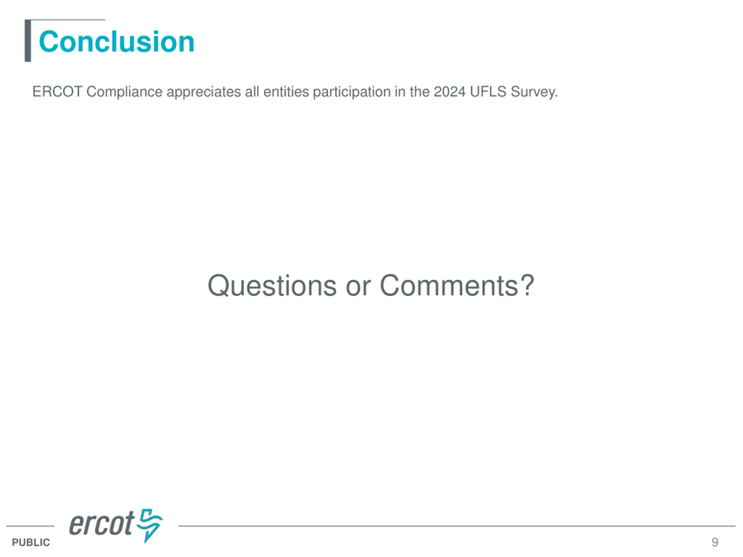Conclusion ERCOT Compliance appreciates all entities participation in the 2024 UFLS Survey. Questions or Comments? 9 PUBLIC