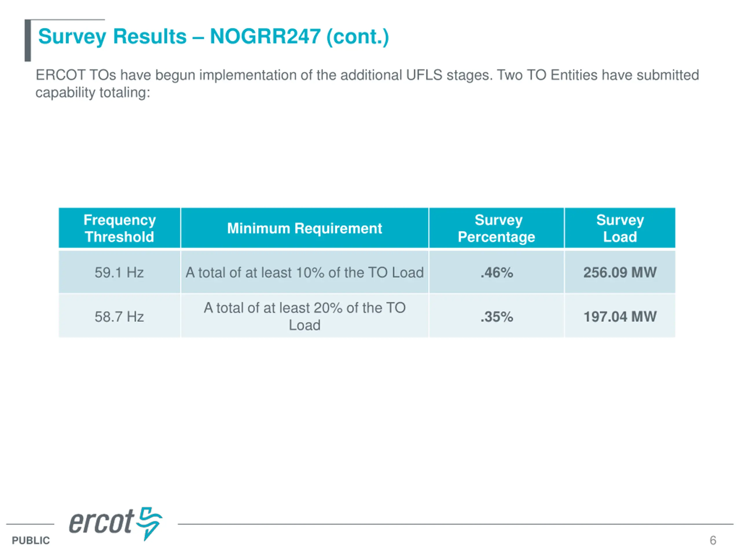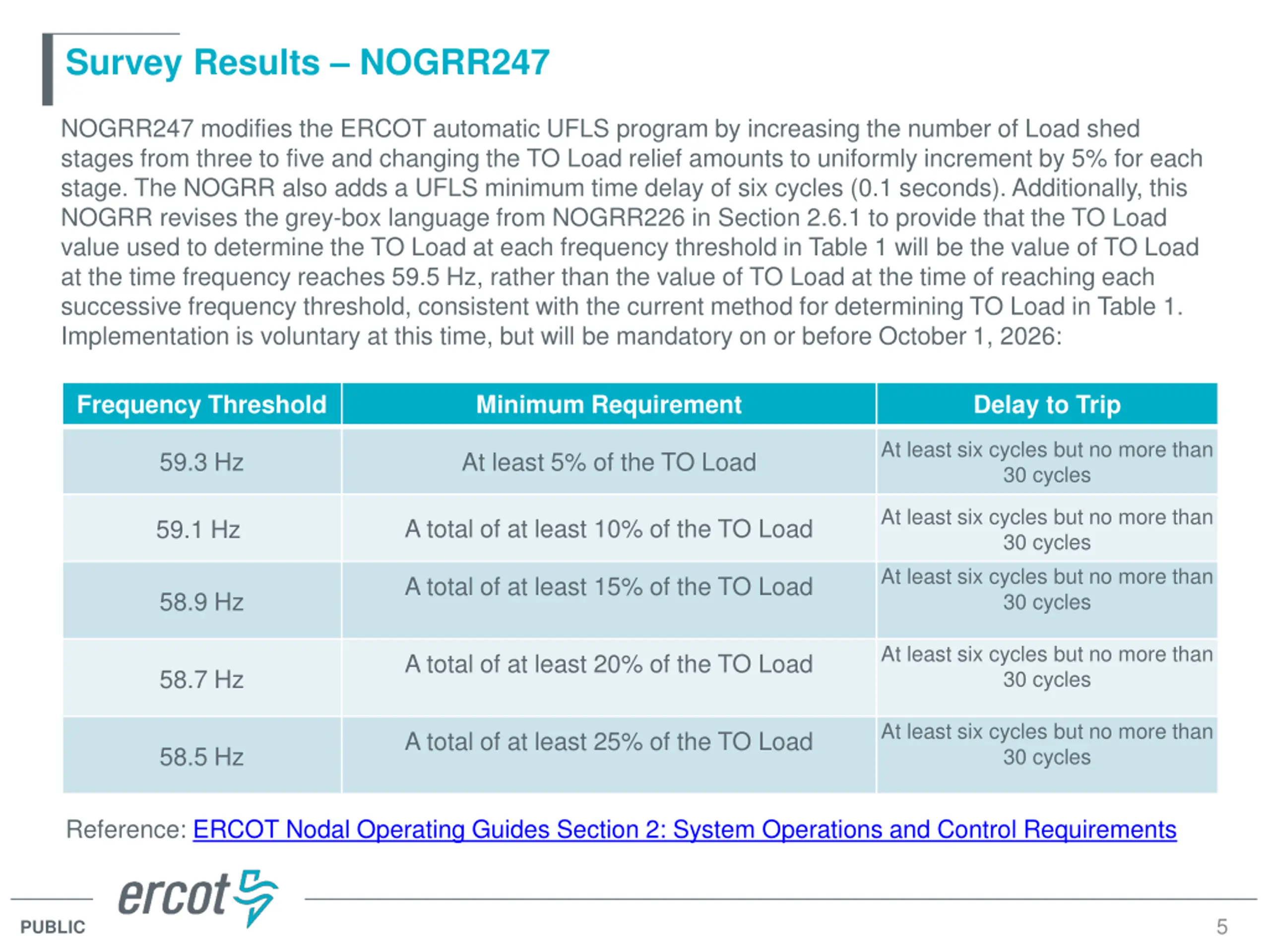 Survey Results NOGRR247 NOGRR247 modifies the ERCOT automatic UFLS program by increasing the number of Load shed stages from three to five and changing the TO Load relief amounts to uniformly increment by 5% for each stage. The NOGRR also adds a UFLS minimum time delay of six cycles (0.1 seconds). Additionally, this NOGRR revises the grey-box language from NOGRR226 in Section 2.6.1 to provide that the TO Load value used to determine the TO Load at each frequency threshold in Table 1 will be the value of TO Load at the time frequency reaches 59.5 Hz, rather than the value of TO Load at the time of reaching each successive frequency threshold, consistent with the current method for determining TO Load in Table 1. Implementation is voluntary at this time, but will be mandatory on or before October 1, 2026: Frequency Threshold Minimum Requirement Delay to Trip At least six cycles but no more than 30 cycles 59.3 Hz At least 5% of the TO Load At least six cycles but no more than 30 cycles At least six cycles but no more than 30 cycles A total of at least 10% of the TO Load 59.1 Hz A total of at least 15% of the TO Load 58.9 Hz At least six cycles but no more than 30 cycles A total of at least 20% of the TO Load 58.7 Hz At least six cycles but no more than 30 cycles A total of at least 25% of the TO Load 58.5 Hz Reference: ERCOT Nodal Operating Guides Section 2: System Operations and Control Requirements 5 PUBLIC