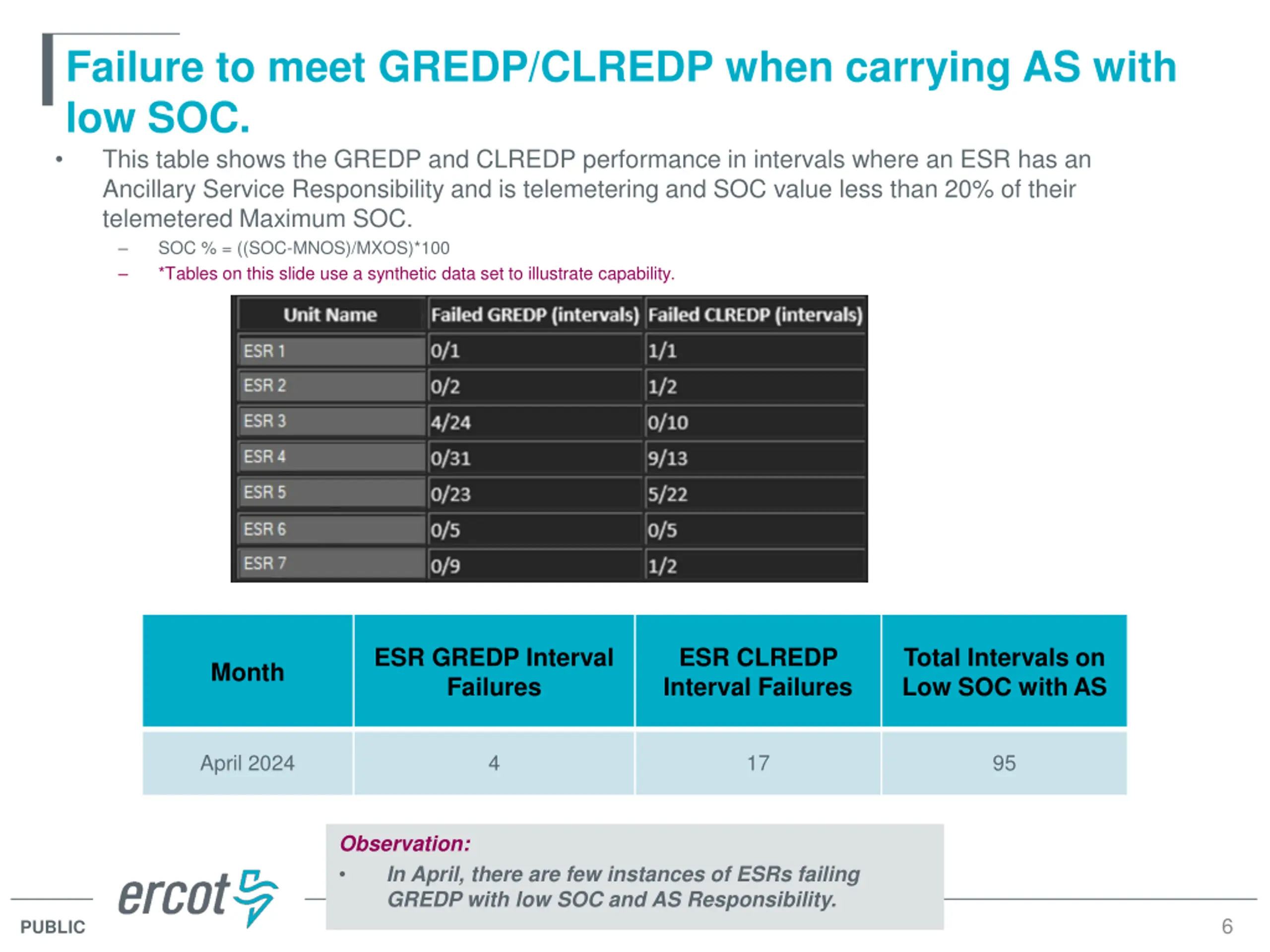 Failure to meet GREDP/CLREDP when carrying AS with low SOC. This table shows the GREDP and CLREDP performance in intervals where an ESR has an Ancillary Service Responsibility and is telemetering and SOC value less than 20% of their telemetered Maximum SOC. SOC % = ((SOC-MNOS)/MXOS)*100 *Tables on this slide use a synthetic data set to illustrate capability. ESR GREDP Interval Failures ESR CLREDP Interval Failures Total Intervals on Low SOC with AS Month April 2024 4 17 95 Observation: In April, there are few instances of ESRs failing GREDP with low SOC and AS Responsibility. 6 PUBLIC