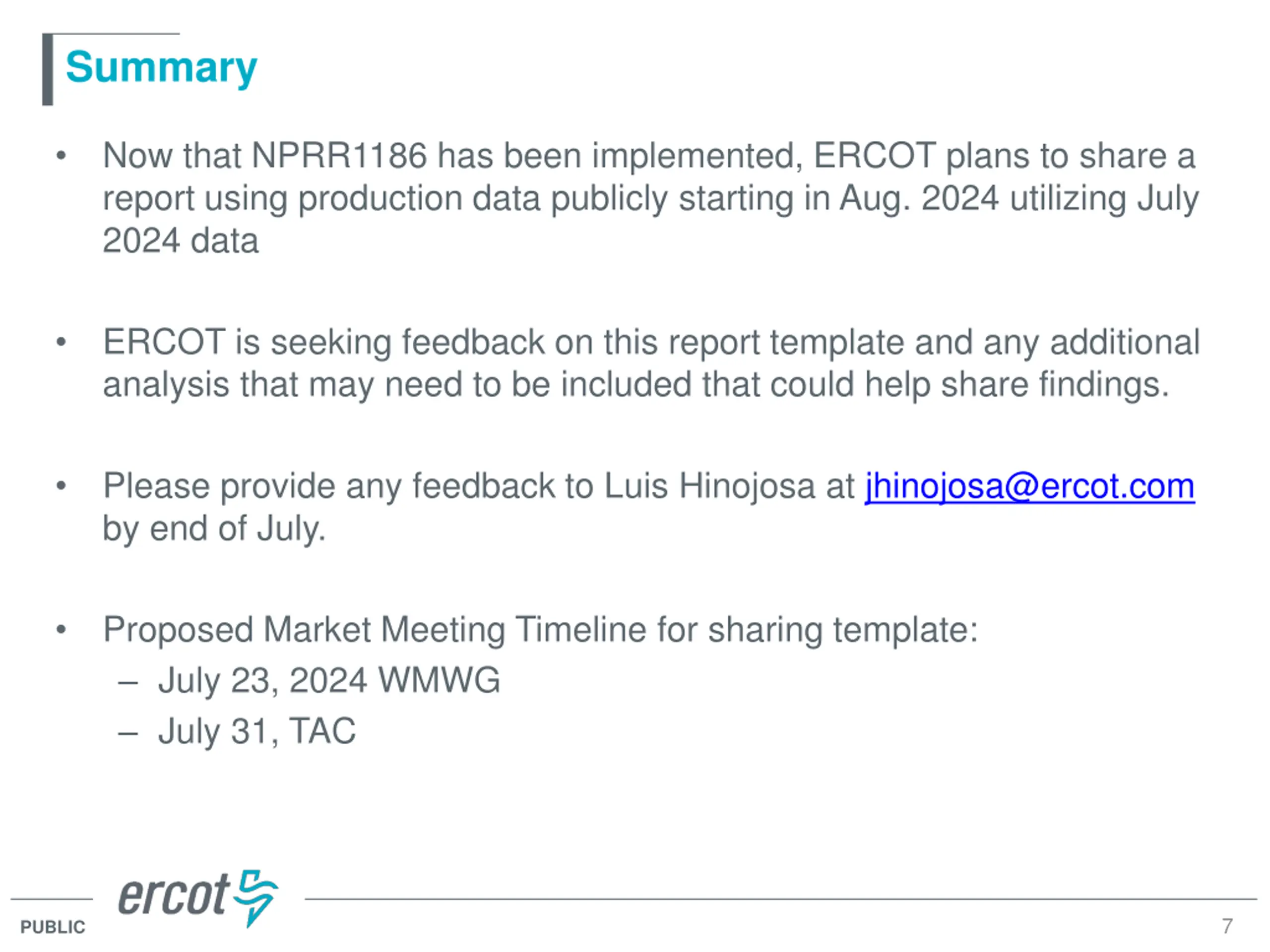 Summary Now that NPRR1186 has been implemented, ERCOT plans to share a report using production data publicly starting in Aug. 2024 utilizing July 2024 data ERCOT is seeking feedback on this report template and any additional analysis that may need to be included that could help share findings. Please provide any feedback to Luis Hinojosa at jhinojosa@ercot.com by end of July. Proposed Market Meeting Timeline for sharing template: July 23, 2024 WMWG July 31, TAC 7 PUBLIC