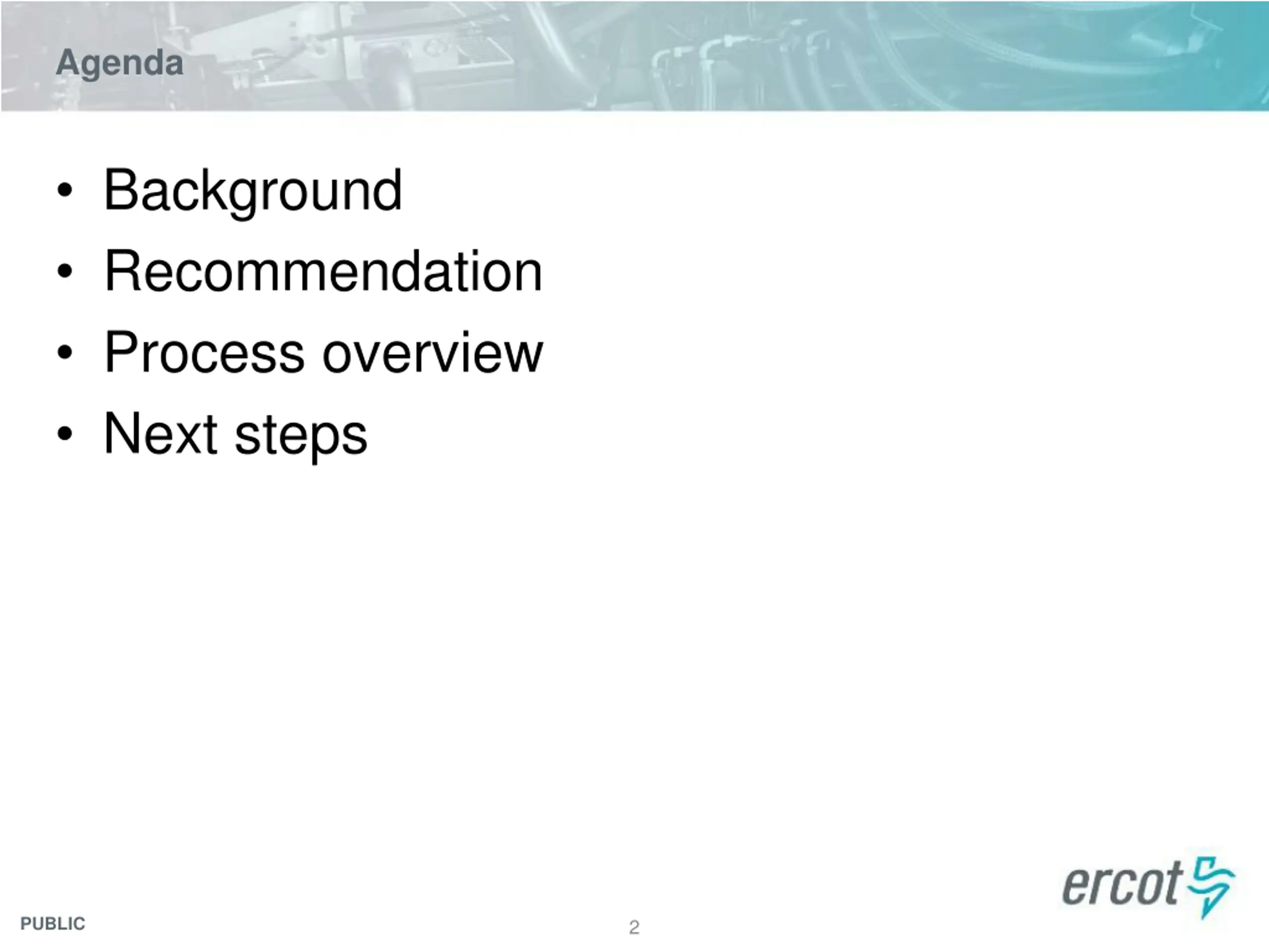 Agenda Background Recommendation Process overview Next steps PUBLIC 2