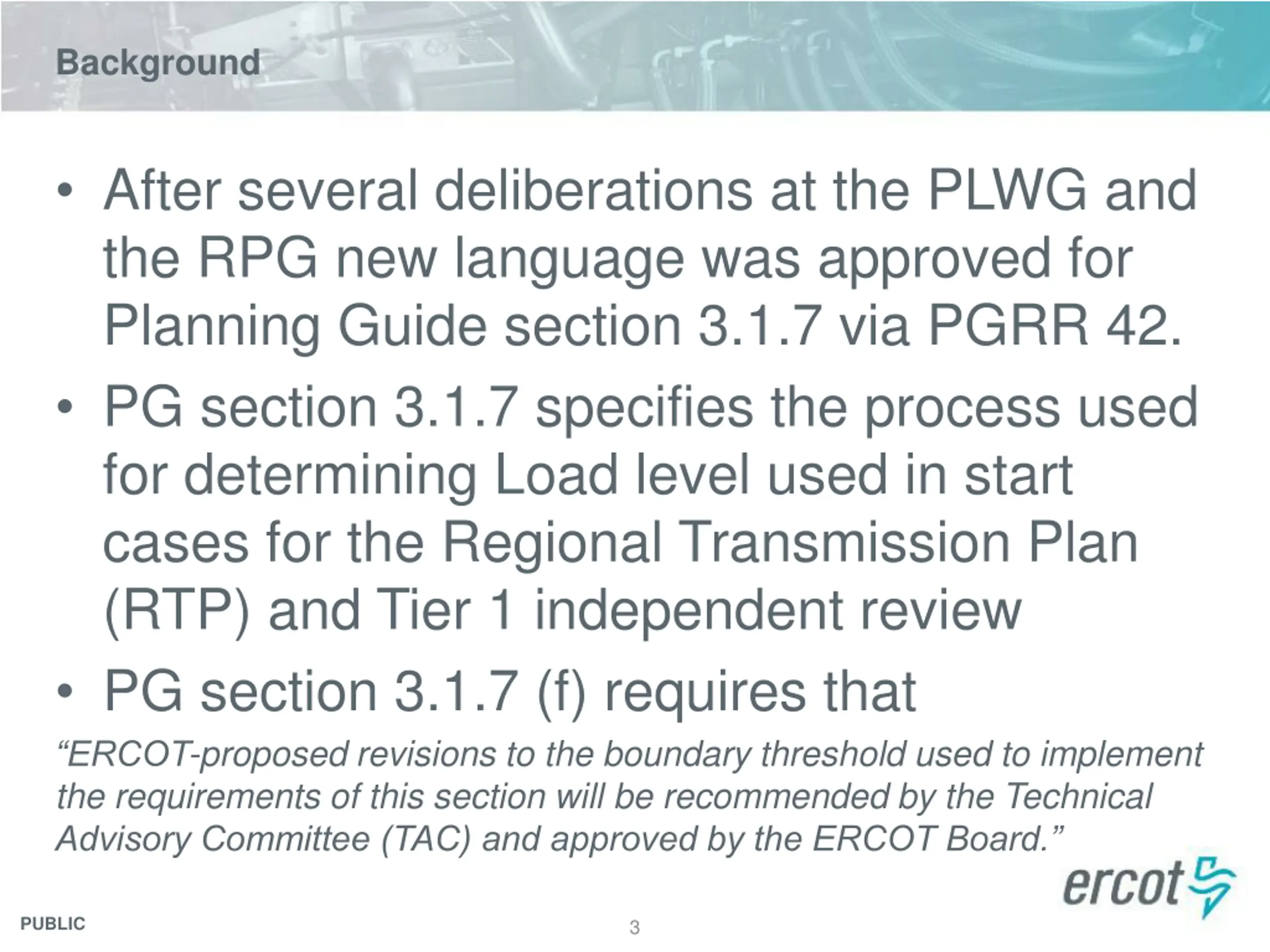 Background After several deliberations at the PLWG and the RPG new language was approved for Planning Guide section 3.1.7 via PGRR 42. PG section 3.1.7 specifies the process used for determining Load level used in start cases for the Regional Transmission Plan (RTP) and Tier 1 independent review PG section 3.1.7 (f) requires that ERCOT-proposed revisions to the boundary threshold used to implement the requirements of this section will be recommended by the Technical Advisory Committee (TAC) and approved by the ERCOT Board. PUBLIC 3