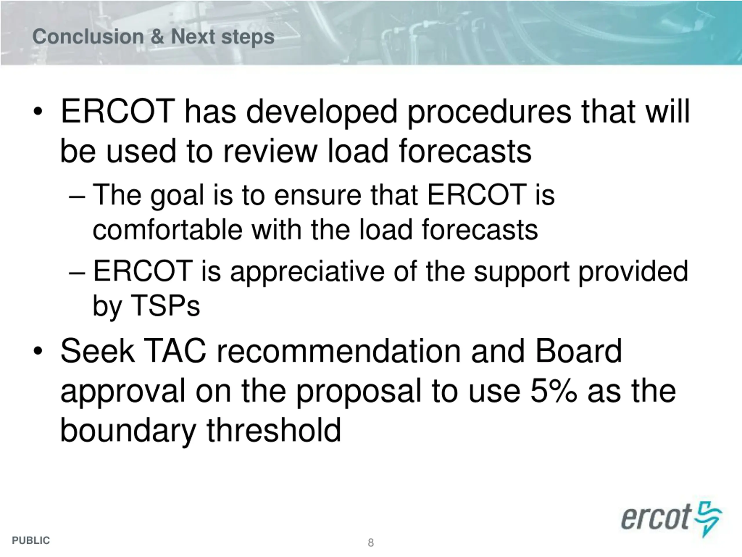Conclusion & Next steps ERCOT has developed procedures that will be used to review load forecasts The goal is to ensure that ERCOT is comfortable with the load forecasts ERCOT is appreciative of the support provided by TSPs Seek TAC recommendation and Board approval on the proposal to use 5% as the boundary threshold PUBLIC 8