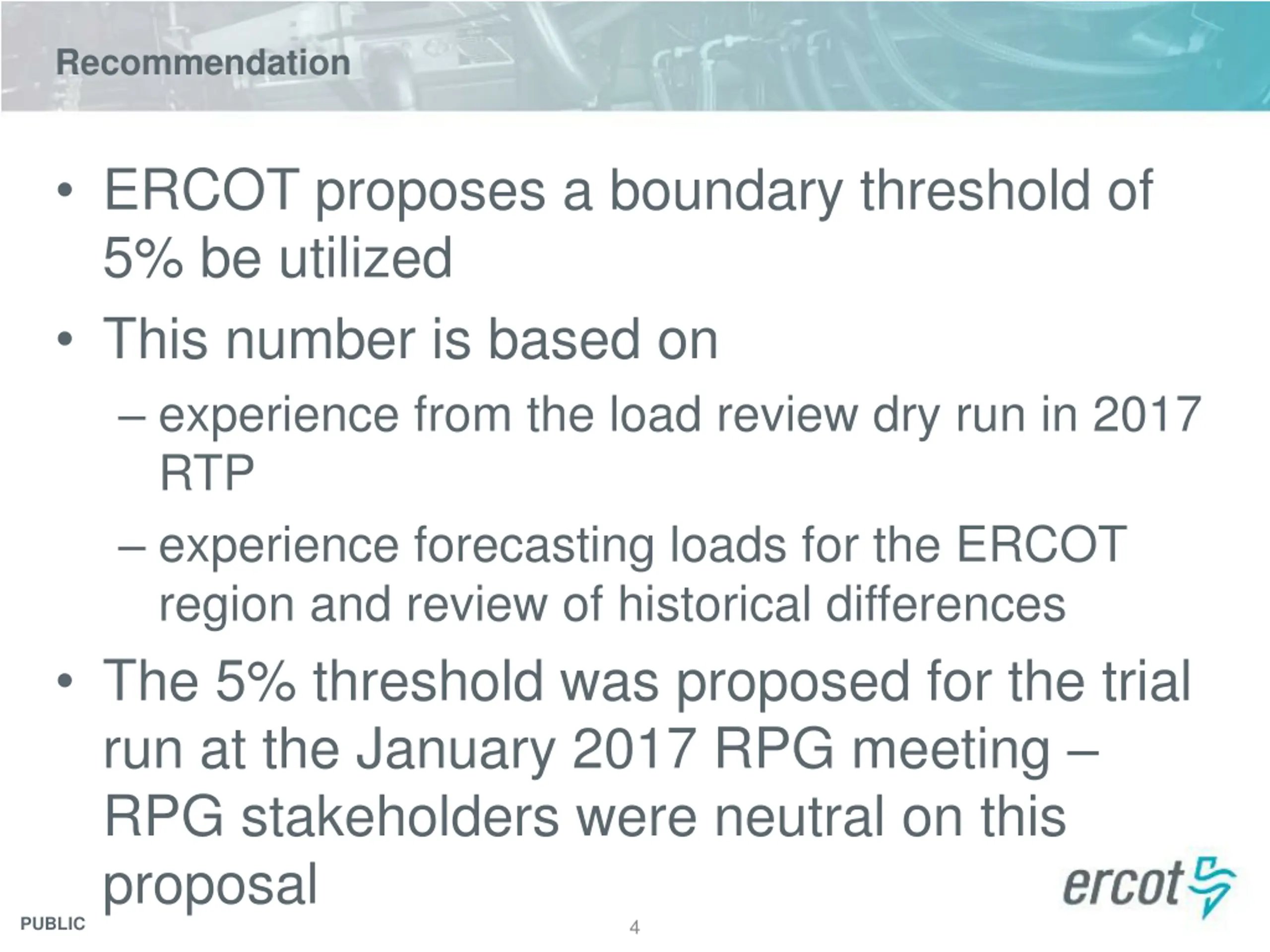 Recommendation ERCOT proposes a boundary threshold of 5% be utilized This number is based on experience from the load review dry run in 2017 RTP experience forecasting loads for the ERCOT region and review of historical differences The 5% threshold was proposed for the trial run at the January 2017 RPG meeting RPG stakeholders were neutral on this proposal 4 PUBLIC