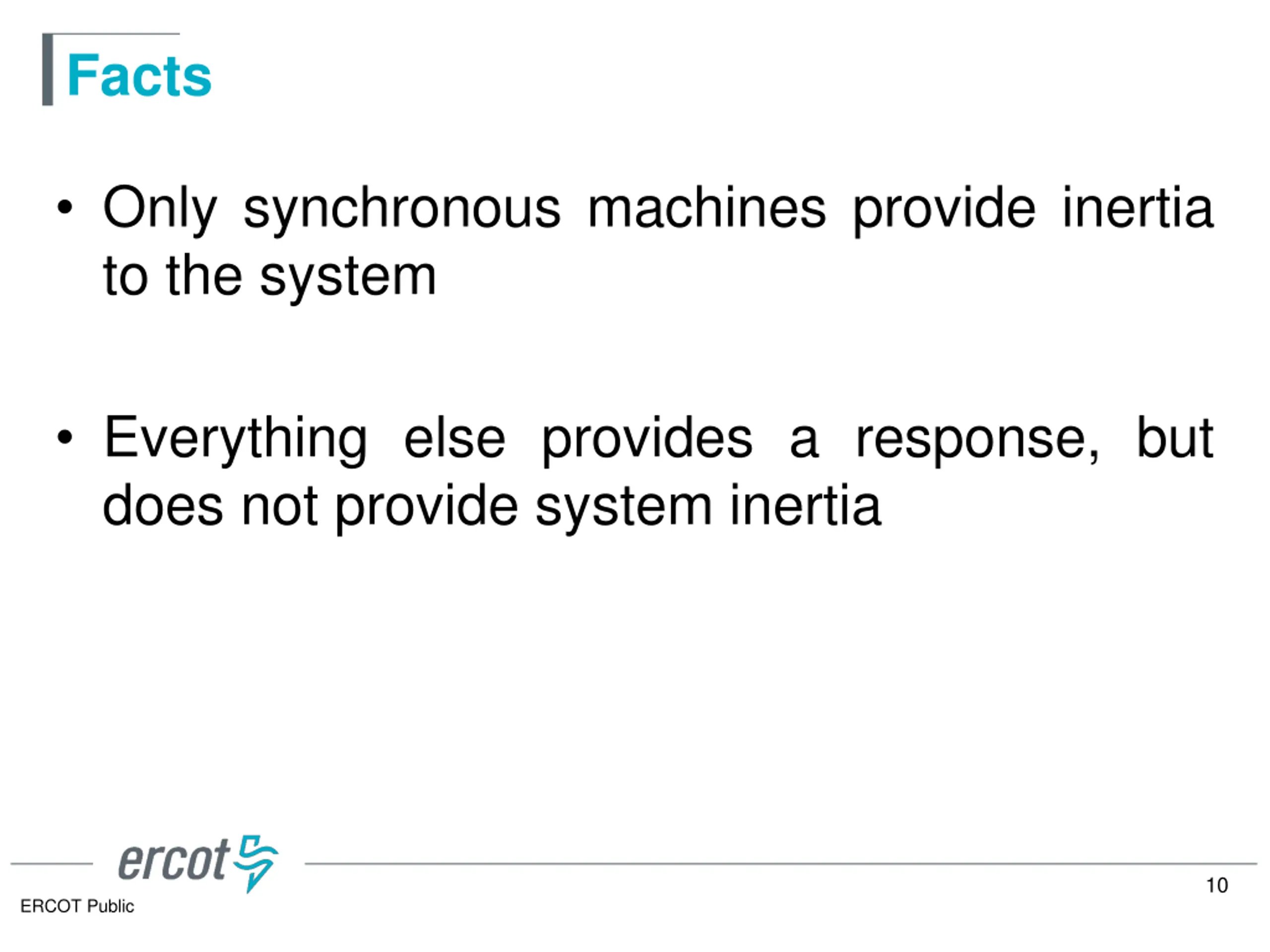 Facts Only synchronous machines provide inertia to the system Everything else provides a response, but does not provide system inertia 10 ERCOT Public